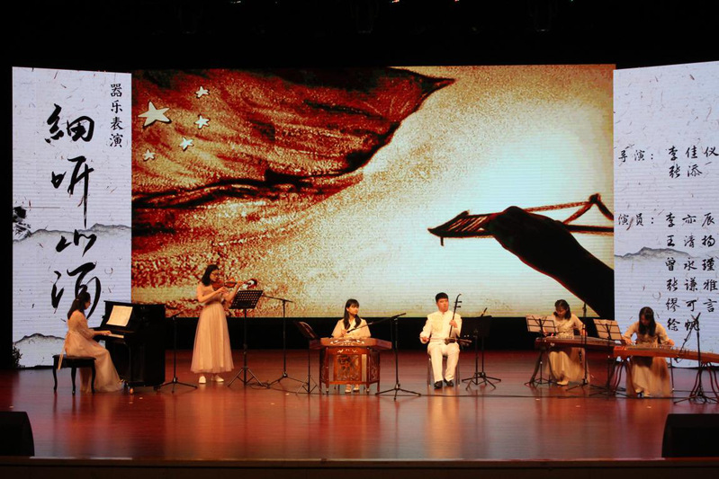 歌曲串烧《一程风雨一程歌》将数首耳熟能详的歌曲精妙组合在一起,歌手唱扬着的“五星红旗”,走在“希望的田野上”,传唱“春天的故事”,同心祈愿“天耀中华”。教师朗诵《伟大的觉醒》,追忆着改革开放之后真理讨论、农村改革、恢复高考等每处细节,敬佩每一份魄力,赞颂改革开放这一伟大的觉醒。乐器《细听山河》中,丝竹曼妙,琴声朗朗,传统筝琴与西洋乐器交相辉映,沙画背景勾勒大好河山,雅乐和鸣共谱音韵华章。