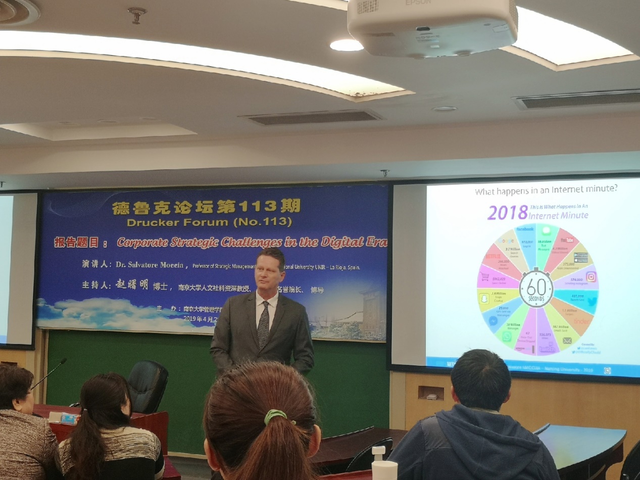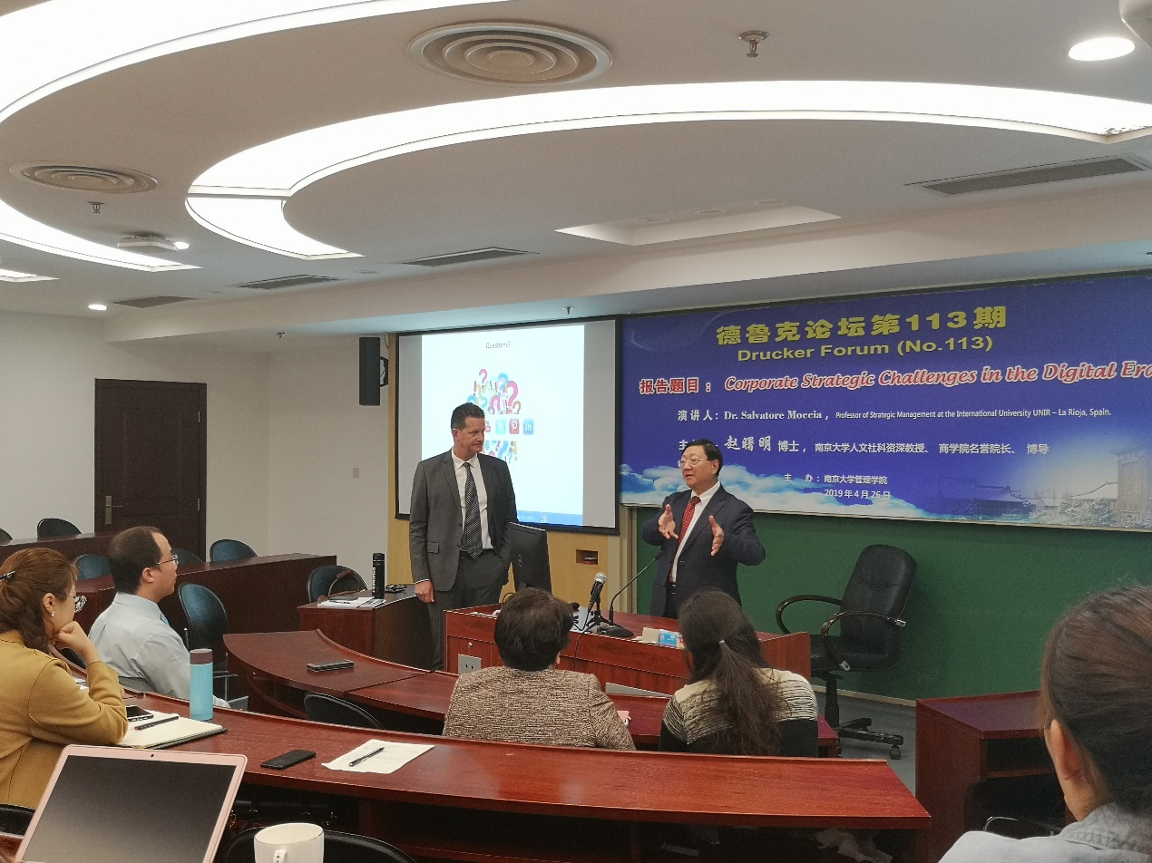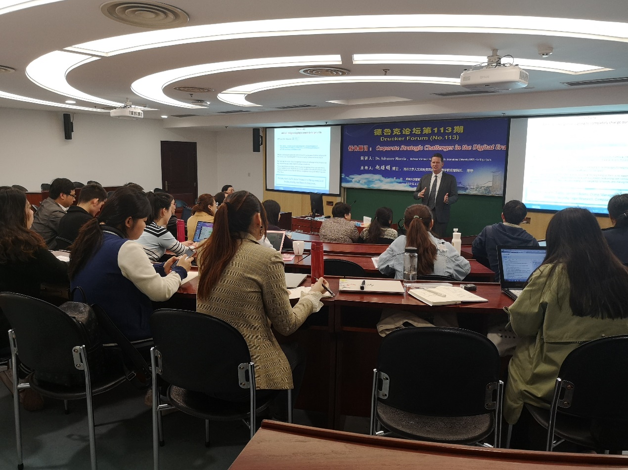 2019年4月26日上午10点30分,德鲁克论坛第113期在安中楼312教室顺利举行。西班牙利奥哈国际大学Salvatore Moccia教授受邀作了题为“Corporate Strategic Challenges in the Digital Era”的主题报告。论坛由永利集团88304官网人文社会科学资深教授、永利集团88304官网名誉院长赵曙明教授主持。30多位教师、博士生和硕士生参加了本次论坛。