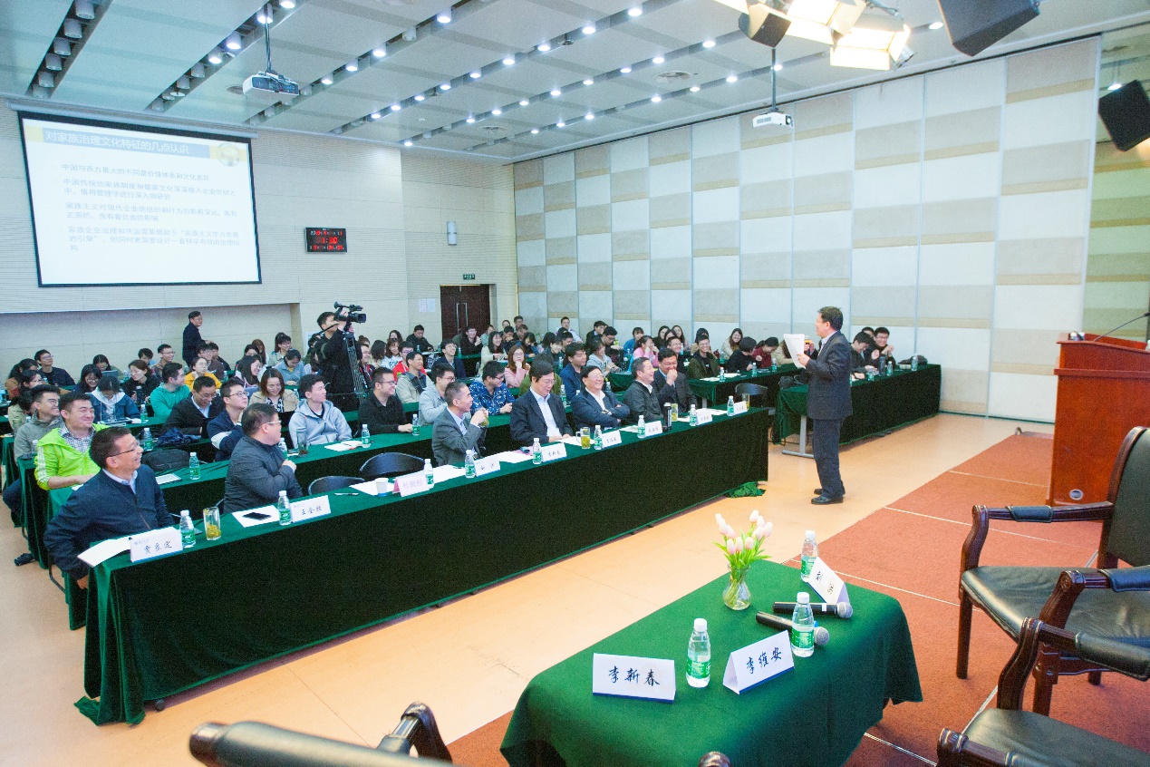 李新春教授的报告主题是“家族治理的中国文化特征”。他指出,在现今业以就业发展为导向的经济发展态势下,民营企业为解决就业问题作出了重要贡献,其中85.4%的民营企业为家族企业,而家族企业治理在中国具有其独特性,包括管理层面家族文化的深入持久性(家族成员治理 VS 职业经理人治理)、用人层面基于血缘关系的特殊信任和差序格局、领导层面遵循父系家长式作风和领导权威、制度层面在市场转型中企业的家族所有权控制度较高等。这样的家族治理和中国式关系下往往会出现“共享领导”和“共治CEO”(Co-CEOs)的现象,有弊有利,弊端在于不可控的人治因素过多,代际间的管理权交割不够彻底,同时出现两个声音,限制继任管理者完全建立起自己独立的管理体系,且对培养接班人的能力要求较高;另一方面,益处在于可以将一直以来积累的经营理念、文化、隐性的企业家知识和经验、关系网络等较好地传承下去。李新春教授表示,随着法治的健全,家族式治理的负面影响会逐渐减弱,达到去粗取精的效果。他倡导在企业制度理论方面暂时无法超越西方发达国家的情形下,我们更应充分发挥中国传统文化在企业治理中的特色作用,处理好家族本身的治理和公司治理的关系,即既要治好家也要治好企业;此外,还要处理好家族正式治理和非正式治理之间的关系,加强家族企业的制度保障建设和文化建设,降低经营风险,促进家族企业的持续发展。