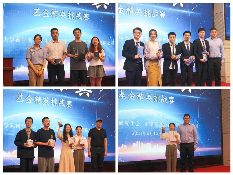 经过一个月的学习沉淀,“商汇添翼”基金精英挑战赛于6月15日在安中楼举办。永利集团88304官网学生工作办公室副主任马骏老师、张金玲老师、汇添富南京分公司负责人刘曦先生、汇添富南京分公司渠道经理张愉欣、永利集团88304官网学生工作办公室刘宇老师作为嘉宾及评委出席了本次活动。最终一支队伍摘得桂冠,两支队伍分别获得二三等奖。并且,队伍内的每位成员均获得相应奖次的奖品。此外,一位同学获得最佳优秀个人并抱归全场最重磅奖品。以上同学均获得汇添富南京分公司实习资格。