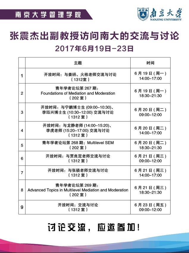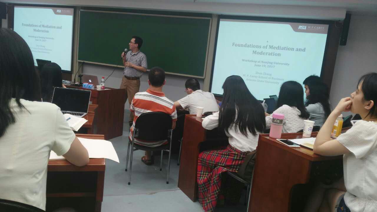 2017年6月19日-23日,亚利桑那州立大学杰出副教授张震博士受工商管理系邀请,来永利集团官网访问交流。张震老师的研究方向包括:领导力开发、团队研究、创业者性格与行为,以及高级定量研究方法。他的研究成果发表于多个国际顶级管理学期刊,并担任这些期刊的编委,包括Academy of Management Journal, Journal of Applied Psychology, Personnel Psychology, Organizational Behavior and Human Decision Processes, Psychological Bulletin, Psychological Methods等。在为期五天的访问交流中,张震老师为来自各地的师生们开展了三场青年学者论坛,向南大师生分享最前沿的定量研究方法。三次论坛均由贾良定教授主持。