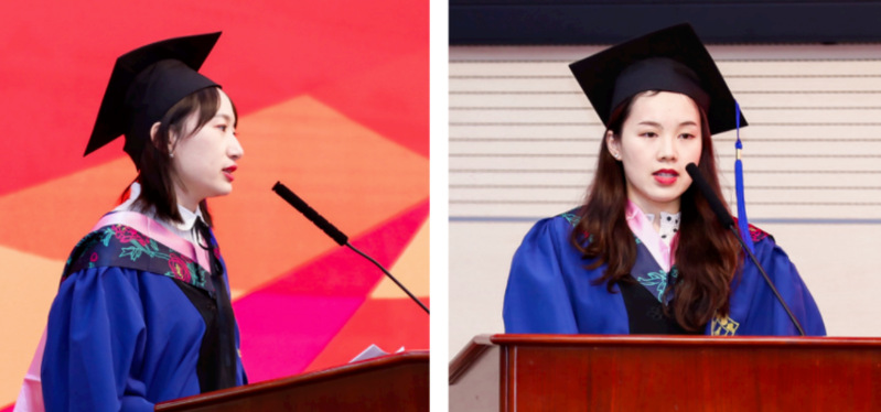 2018A班朱荻同学和2018S班吕旦妮同学作为毕业生代表发表感言,她们表示在南大收获太多,每一次案例分析和社会实践,都将理论和实践完美结合,同学们互相进步、互相鼓励、共同成长,在学校生活的时光终生难忘。