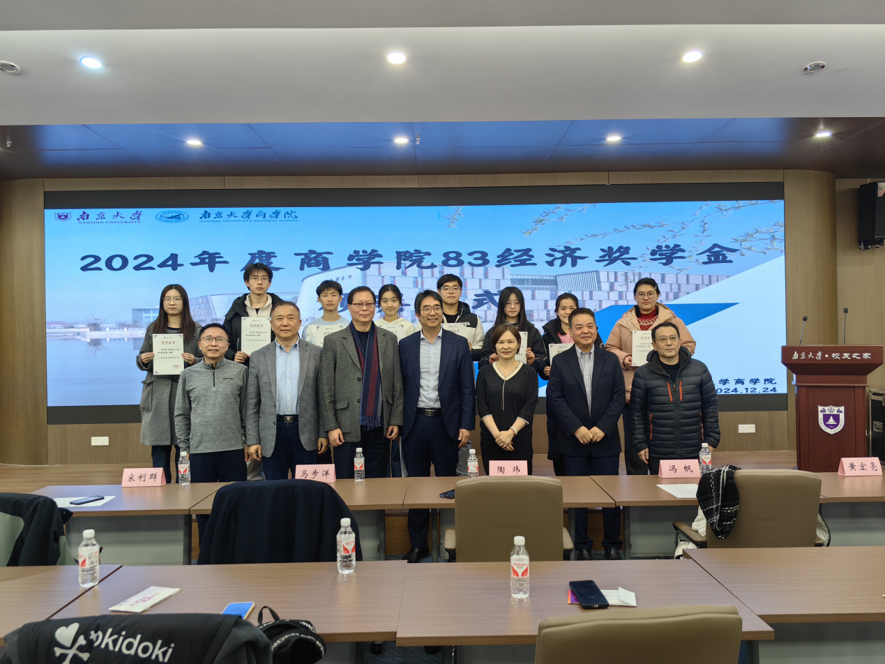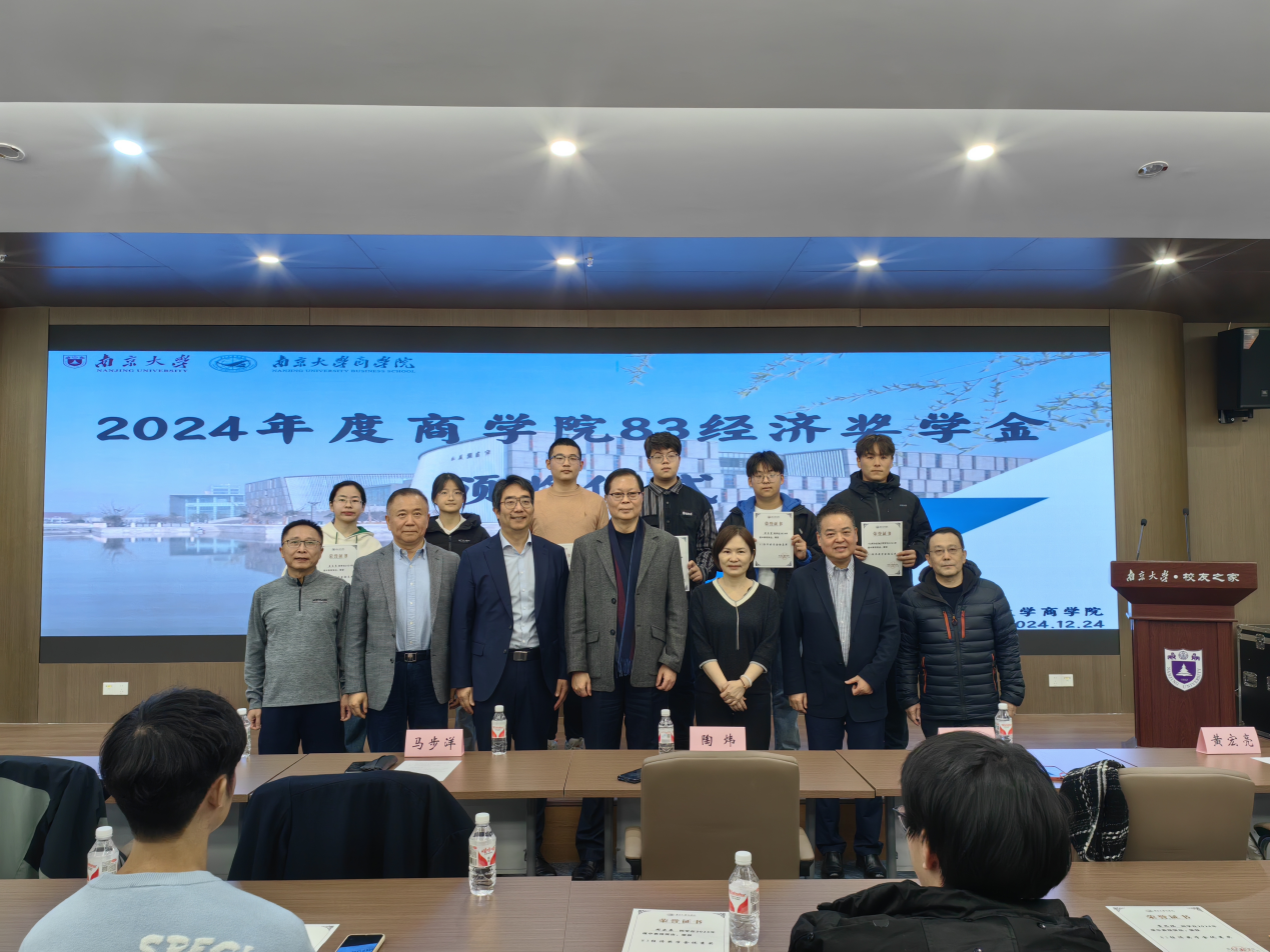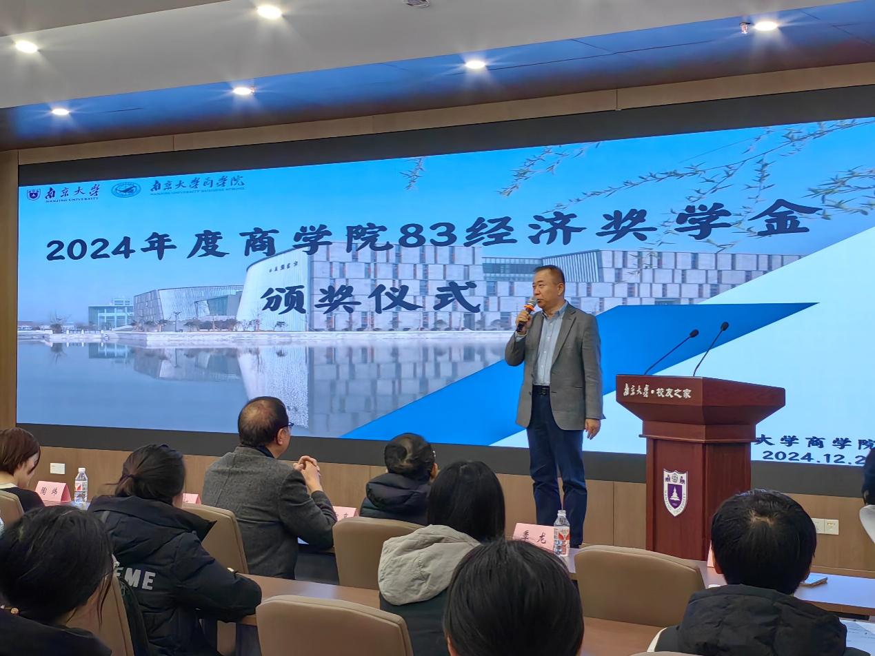 2024年12月24日下午13:00,2024年度永利集团88304官网83经济奖学金颁奖仪式在仙林校区杜厦图书馆校友之家隆重举行。永利集团88304官网校友事务与发展工作处处长、永利集团88304官网校友总会秘书长冯帆教授,83经济奖学金设奖校友代表黄宏亮、陶炜、马步洋、宋利群、季龙共同出席颁奖仪式。仪式由永利集团88304官网党委副书记王宇伟教授主持。