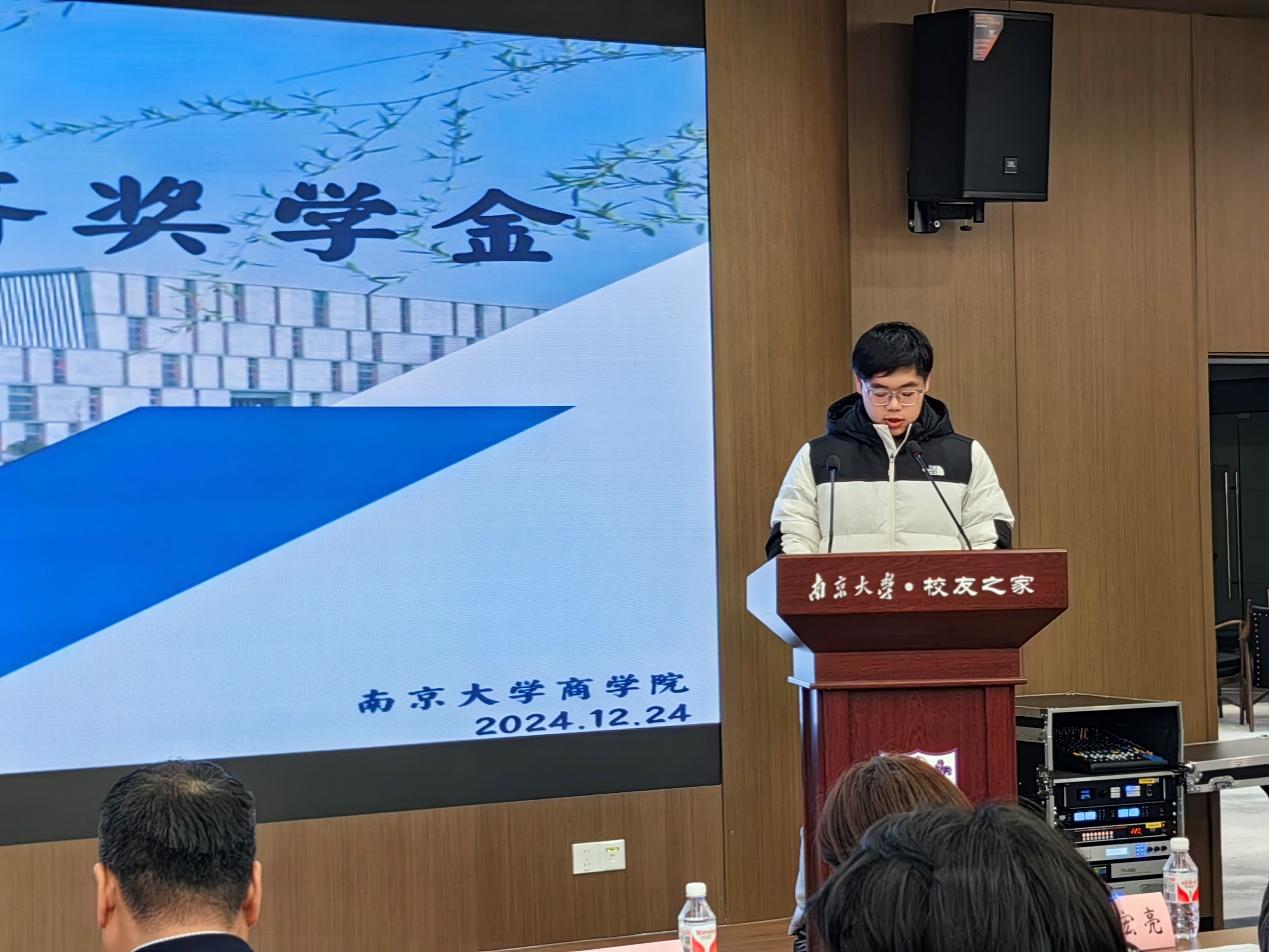 2023级经济学系本科生刘棣文同学和2023级产业经济学系本科生孟乐乐同学作为获奖代表,分别发表了获奖感言。他们向给予他们成长支持的学校和学院以及慷慨捐赠关爱后辈的师兄师姐表达了真挚的感谢,并表达了在未来继续砥砺前行、以己之力回馈社会的决心与希望。