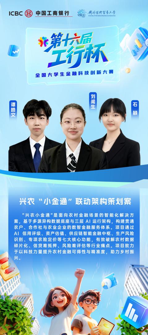 12月6日,第十六届“工行杯”全国大学生金融科技创新大赛总决赛在对外经济贸易大学成功举办。来自永利集团88304官网、西安交通大学、哈尔滨工业大学、中山大学等13所高校的参赛选手齐聚决赛舞台,以思维碰撞和智慧交锋点燃数字金融创新火花。永利集团官网由2023级本科财务管理专业刘闻生、2024级本科金融工程专业谭皓文和2024级本科金融学专业石颖三位同学组成的“小金通”团队凭借《兴农“小金通”联动架构策划案》项目,先后斩获东部赛区总决赛晋级名额与总决赛全国一等奖的优异成绩!
