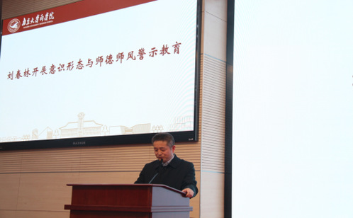 接着,刘春林结合几起负面典型案例对全院教职工开展了意识形态与师德师风警示教育。他强调,全院党员干部和师生员工要时刻保持底线意识和红线思维,提高政治站位,坚决抵制和防范错误思想和言论,唱响主旋律、坚守主阵地、凝聚正能量,为学院全面发展提供强大思想保证。