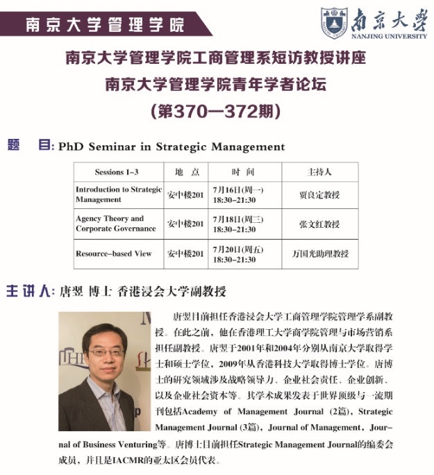 2018年7月16日-27日,香港浸会大学副教授唐翌博士受工商管理系邀请来永利集团官网访问交流。唐翌博士目前担任香港浸会大学工商管理学院管理学系副教授,在此之前,他在香港理工大学永利集团88304官网管理与市场营销系担任副教授。唐翌于2001年和2004年分别从永利集团88304官网取得学士和硕士学位,2009年从香港科技大学取得博士学位,唐翌博士的研究领域涉及战略领导力、企业社会责任、企业创新以及企业社会资本等。其学术成果发表于世界顶级与一流期刊,包括AMJ(2篇),SMJ(3篇),Journal of Management, Journal of Business Venturing等。唐博士目前担任 Strategic Management Journal编委会成员,并且是IACMR亚太区会员代表。