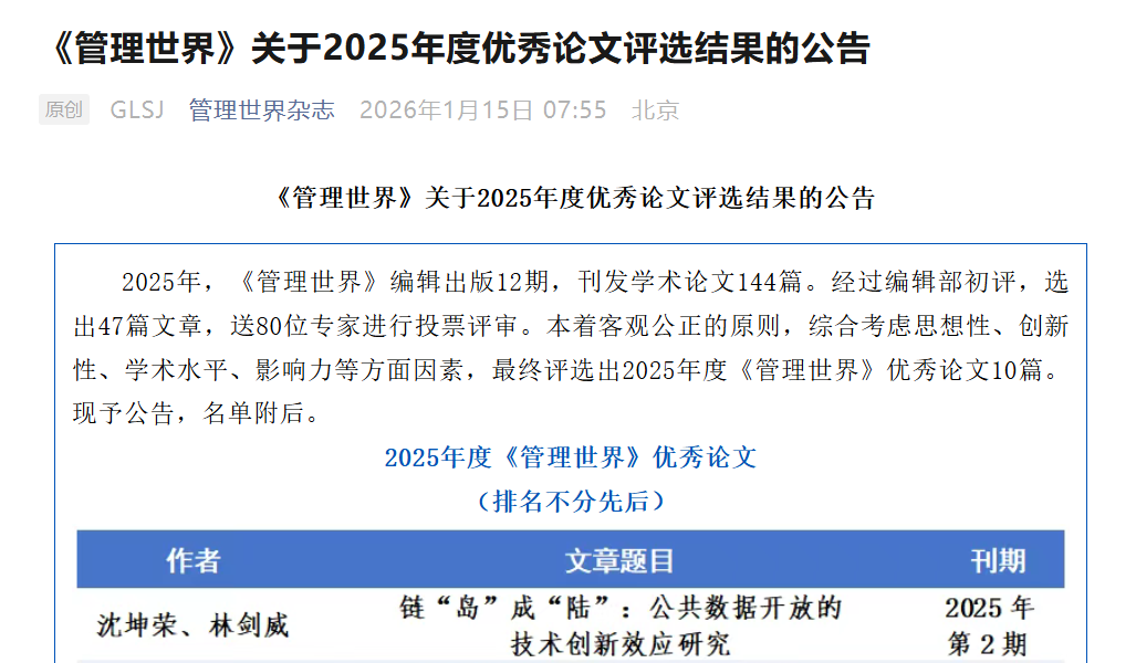 近日,国内中文一流期刊《管理世界》公布2025年度优秀论文评选结果,永利集团官网沈坤荣老师及其学生林剑威合作发表的《链 “岛” 成 “陆”:公共数据开放的技术创新效应研究》(刊发于2025年第2期)经过编辑部初评,专家投票等环节从全年刊发的 144 篇论文中脱颖而出,荣获《管理世界》2025年度优秀论文!