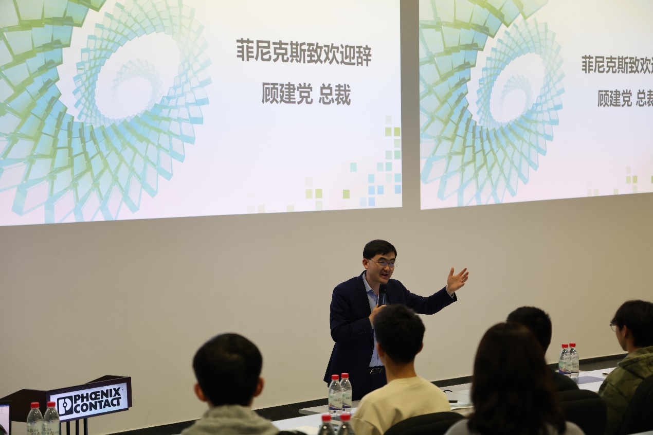 菲尼克斯电气中国公司总裁顾建党致欢迎辞,顾总首先对南大永利集团88304官网师生的到访表示热烈欢迎,盛赞南大永利集团88304官网为培养高质量人才做出的卓越贡献,感谢永利集团88304官网为菲尼克斯输送了大量管理人员,他们为公司高质量发展注入了生机与活力。