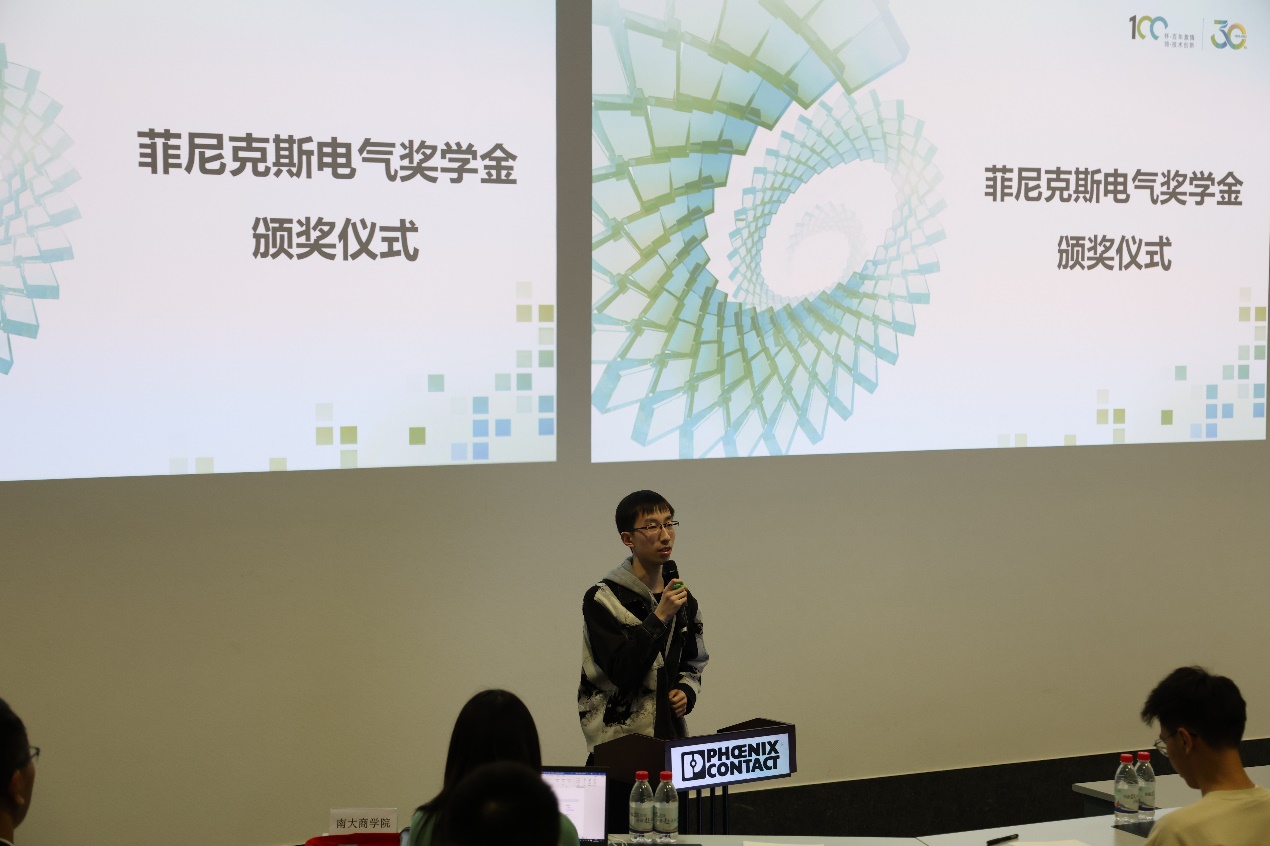 随后南大永利集团88304官网校外兼职导师-顾总、朱总、缪总与王宇伟副书记一同为2022年度菲尼克斯电气奖学金获得者颁发获奖证书合影留念。一等奖学金获奖代表奚哲隽发表获奖感言,他感谢学校和菲尼克斯的认可,分享学习经验鼓励勤学奋进,他对菲尼克斯回报社会的大爱深表钦佩,表示今后必将不忘初心,运用所学承担起对国家和社会的责任。