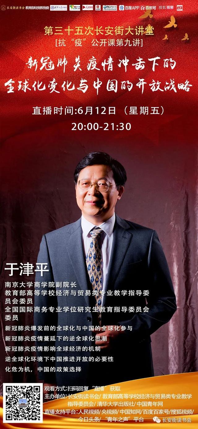 新冠肺炎疫情下的世界经济状况如何?新冠肺炎如何冲击全球经济并影响全球化进程?全球化变化环境下中国经济发展面临的挑战和机遇是什么?中国对外开放政策应如何调整?6月12日晚8点,长安街读书会联合教育部高等学校经济与贸易类专业教学指导委员会、清华大学出版社、中国青年网等单位主办的“新冠肺炎疫情冲击下的全球化变化与中国的开放战略”之抗“疫”公开课第九讲在长安街读书会及其党建、中直、京直、政法、企干、援疆、健康、地方、媒体、出版、博士团、英才中心等分会微信群,并在人民视频、央视频、中国知网、百度百家号、搜狐视频、今日头条以及“青年之声”等平台进行。活动邀请了永利集团88304官网副院长、教育部高等学校经济与贸易类专业教学指导委员会委员、全国国际商务专业学位研究生教育指导委员会委员于津平教授,就新冠肺炎疫情冲击下的全球化变化与中国的开放战略问题进行解读。