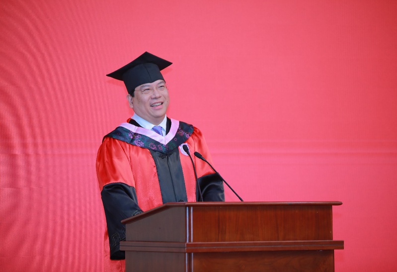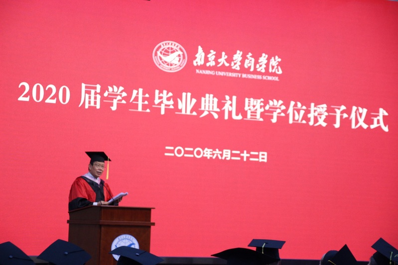 沈坤荣院长发表主题演讲。他代表学院向各位毕业生致以热烈的祝贺,向为同学们的成长付出辛勤汗水的全体教职员工和家人朋友致以诚挚的敬意。