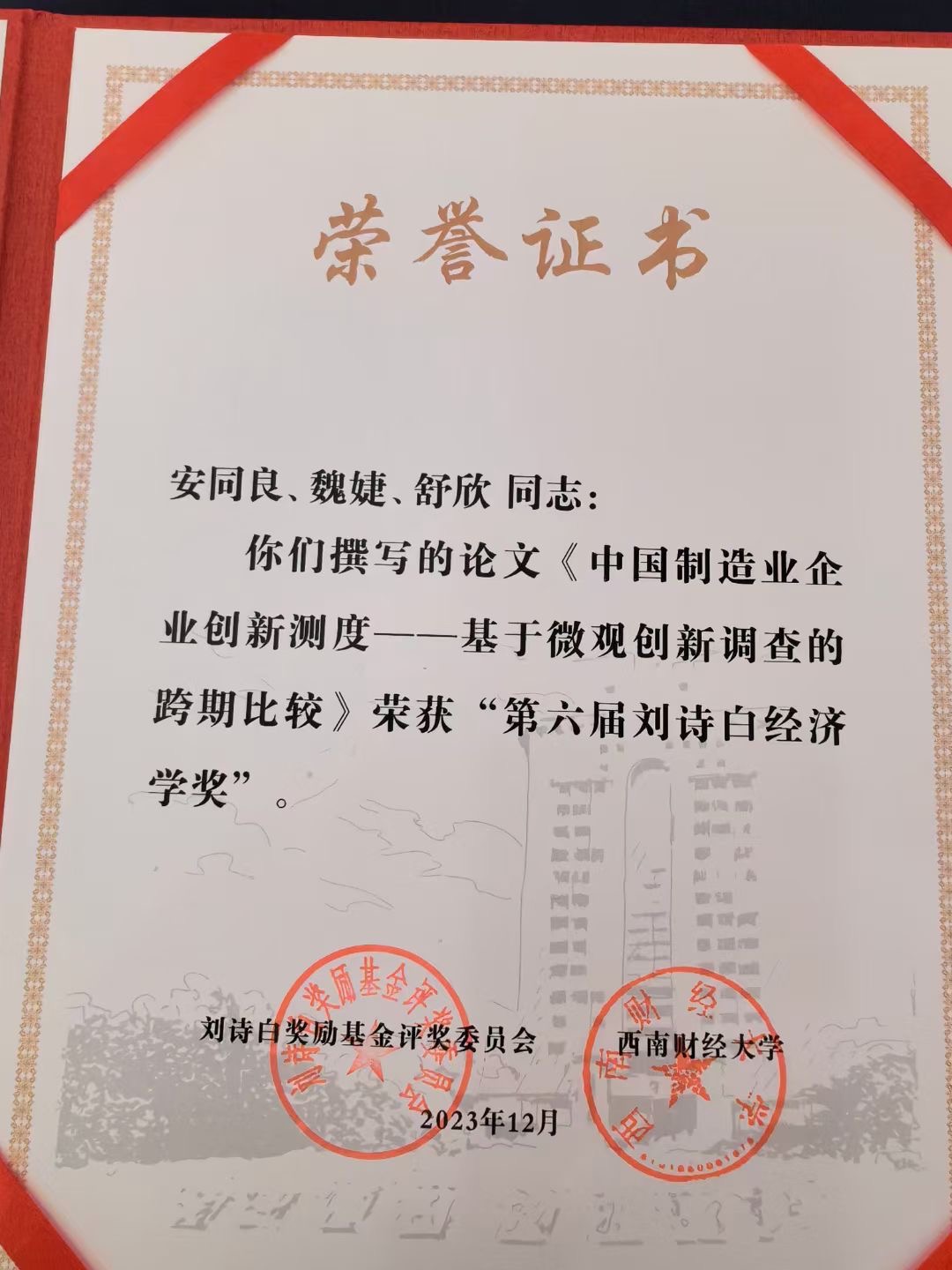 2023年12月9日,第六届刘诗白经济学奖颁奖典礼暨中国经济学创新发展高端论坛在北京举行,永利集团官网安同良教授获得第六届刘诗白经济学奖。