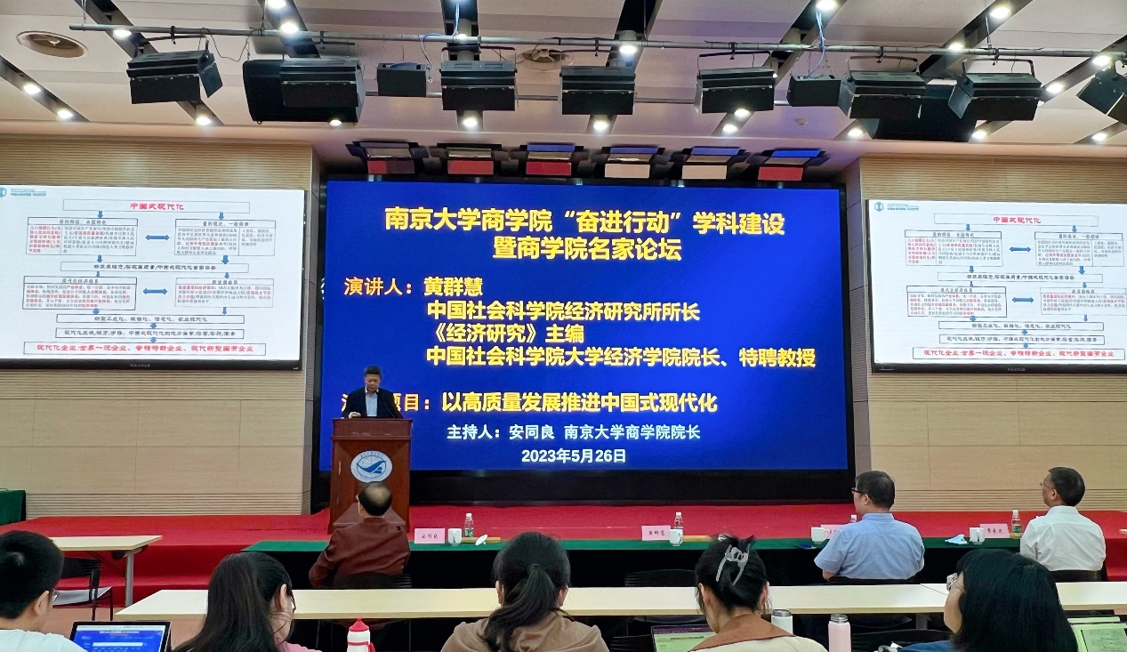 5月26日,永利集团88304官网“奋斗行动”学科建设暨2023年第三期“名家论坛”在鼓楼校区鸿意报告厅举行。中国社会科学院经济研究所所长、《经济研究》主编黄群慧教授受邀作专题报告。永利集团88304官网经济学院院长郑江淮教授、永利集团88304官网管理学院副院长贾良定教授及学院师生代表参加讲座,永利集团88304官网院长安同良教授主持讲座。