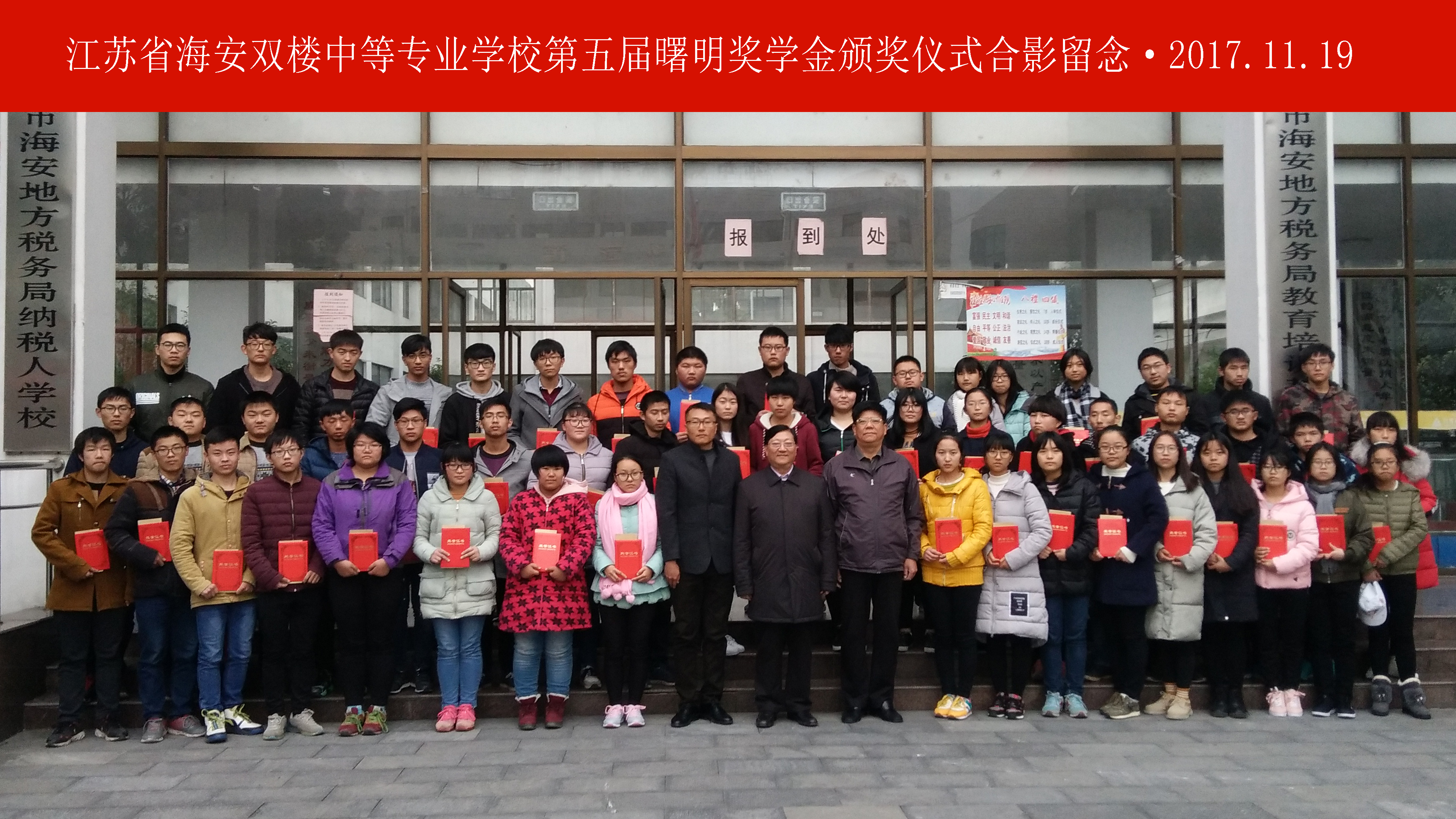2017年11月19日赵曙明年教授在海安县双楼中专与校领导和第5届“曙明奖学金”获得者合影