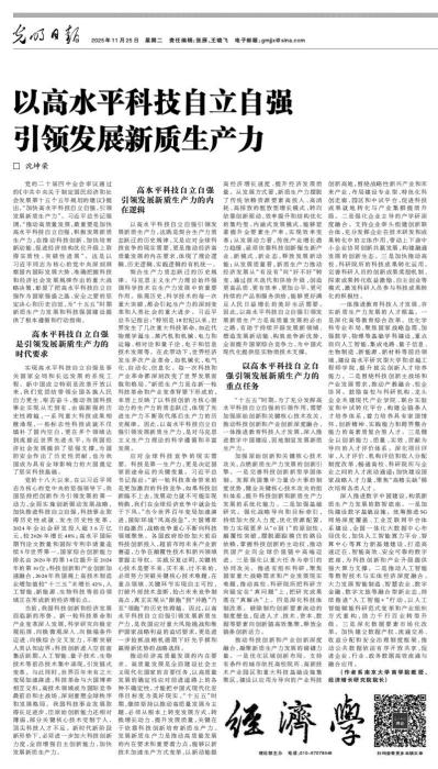 2025年11月25日,永利集团官网沈坤荣教授的文章《以高水平科技自立自强引领发展新质生产力》在《光明日报》第11版理论板块正式刊发。(原文如下)