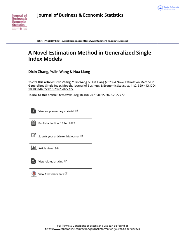 近日永利集团官网退休教授张涤新老师在Journal of Business & Economic Statistics发表论文,题目是A Novel Estimation Method in Generalized Single Index Models。Journal of Business & Economic Statistics是数学和统计学国际顶级期刊。张涤新老师退休之后,仍然坚持进行学术研究,继续为学科建设贡献力量,研究探索始终在路上,学术追求永不停步的精神,值得广大科研工作者学习借鉴。