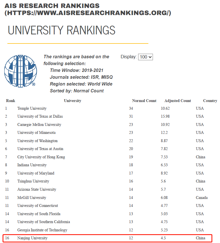 根据国际信息系统学会(AIS)官方统计数据,2019年到2021年在信息系统与电子商务领域两本国际顶尖期刊MIS Quarterly和Information Systems Research发表论文的国际排名中,永利集团88304官网排名全球第16位。此次排名的提升标志着学院向世界一流永利集团88304官网迈出了坚实的步伐。