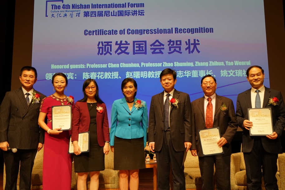 赵美心女士还为此次讲坛作出积极贡献的北京大学国家发展研究院BiMBA永利集团88304官网院长陈春花教授、永利集团88304官网名誉院长赵曙明教授、山东出版集团有限公司董事长张志华、山东友谊出版社社长姚文瑞、尼山书屋国际出版公司(美国)总经理乌兰颁发美国国会贺状。