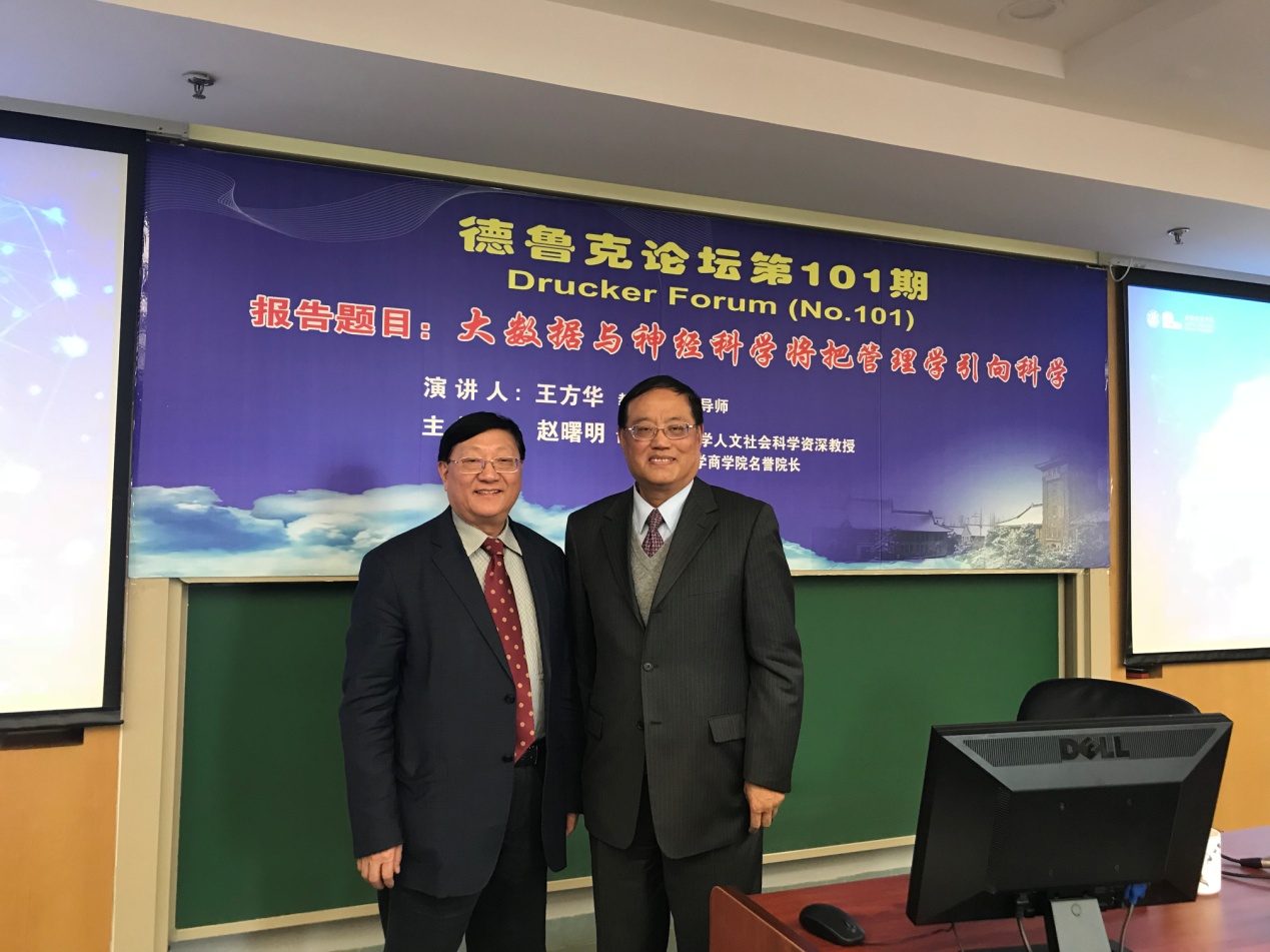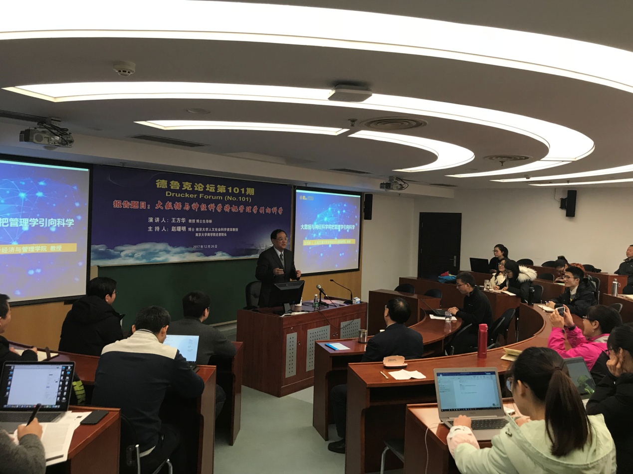 2017年12月26日上午10点,德鲁克论坛第101期在安中楼302顺利举行。本期论坛有幸邀请到上海交通大学安泰经济与管理学院原院长王方华教授做了“大数据与神经科学将把管理学引向科学”的主题演讲。论坛由永利集团88304官网人文社会科学资深教授、永利集团88304官网名誉院长赵曙明博士主持,60多位教师、研究生参与了本次论坛。