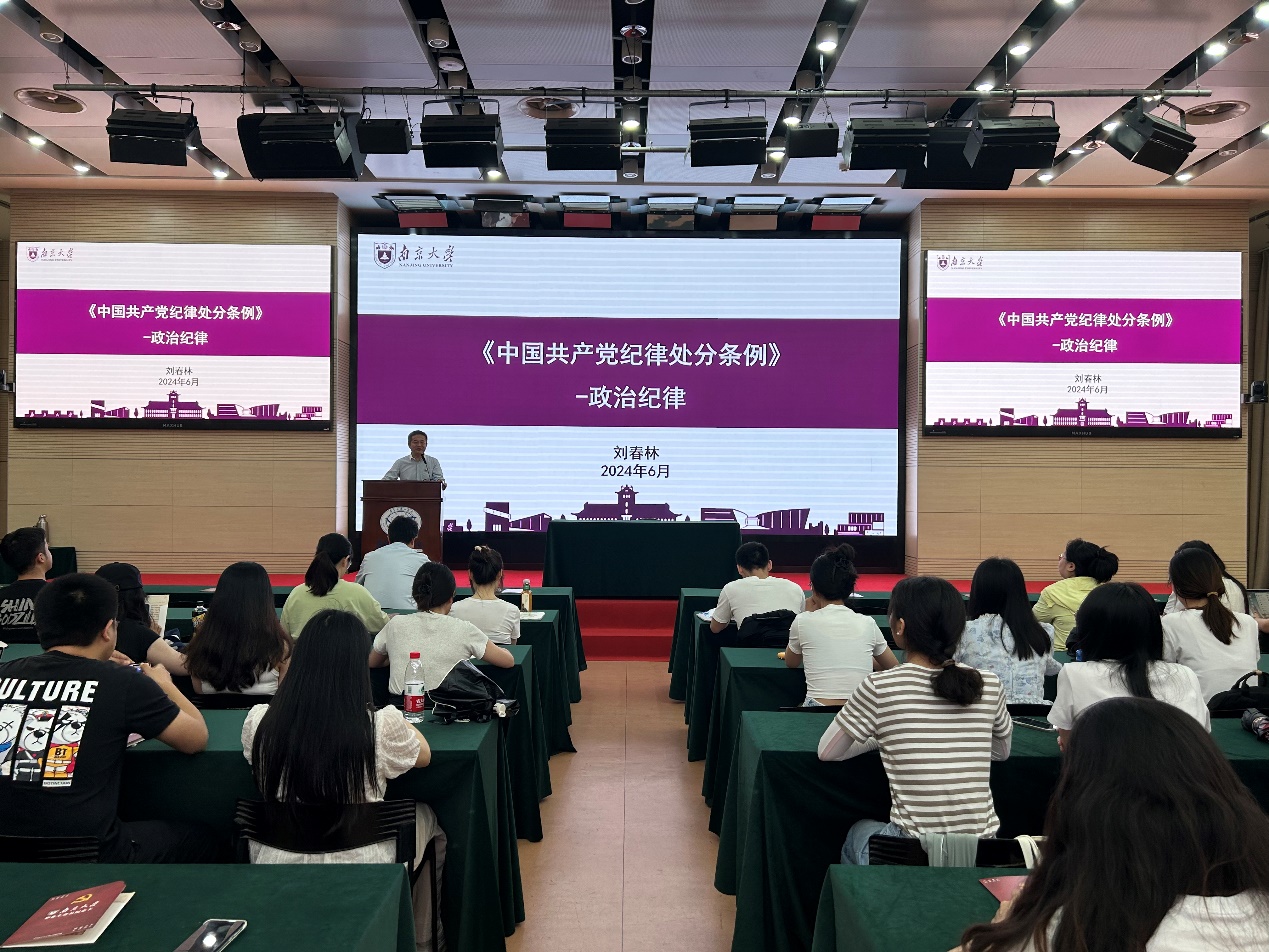 刘春林结合《中国共产党纪律处分条例》的修订背景,围绕《条例》中的“六大纪律”讲授主题党课。刘春林指出,政治纪律是党的“第一纪律”,所有党员要把严明政治纪律和政治规矩摆在首位,在重大原则问题上与党中央保持高度一致,坚定拥护“两个确立”,坚决做到“两个维护”。针对学生党员特点,刘春林结合生动案例,带领大家破解关于“言论自由”、“自由贸易”等若干认识误区。最后,他勉励全体毕业生做有爱心、有温度的南大人,在今后的工作学习中持续学习,应对环境变迁,以南大人特有的社会责任感和使命感投身今后的工作和学习,在新的岗位继续发挥党员先锋模范作用。