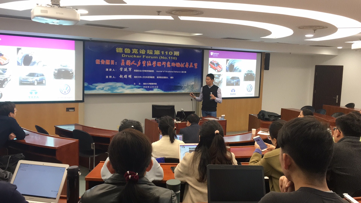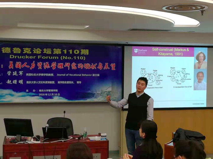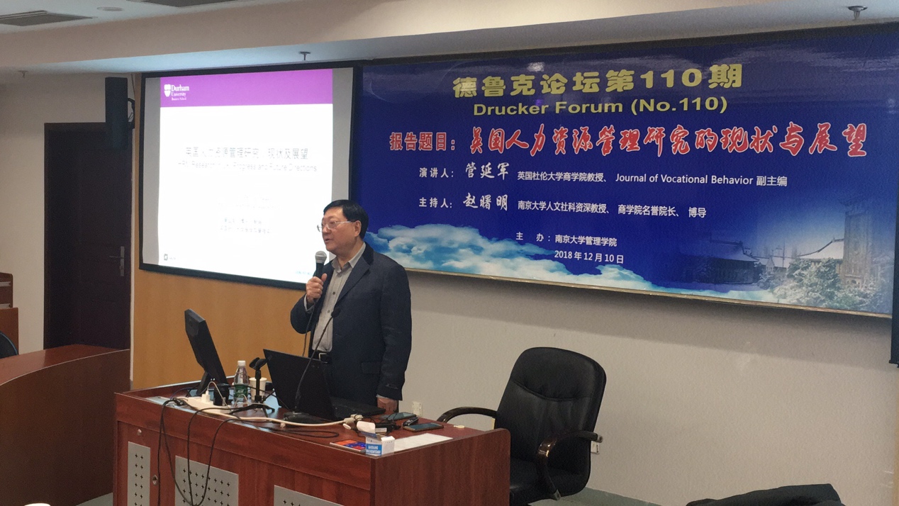 2018年12月10日上午9点,德鲁克论坛第110期在安中楼302顺利举行。英国杜伦大学永利集团88304官网管延军教授受邀作了题为“英国人力资源管理研究的现状与展望”的主题报告。论坛由永利集团88304官网人文社会科学资深教授、永利集团88304官网名誉院长赵曙明教授主持。50多位教师、博士生和硕士生参加了本次论坛。