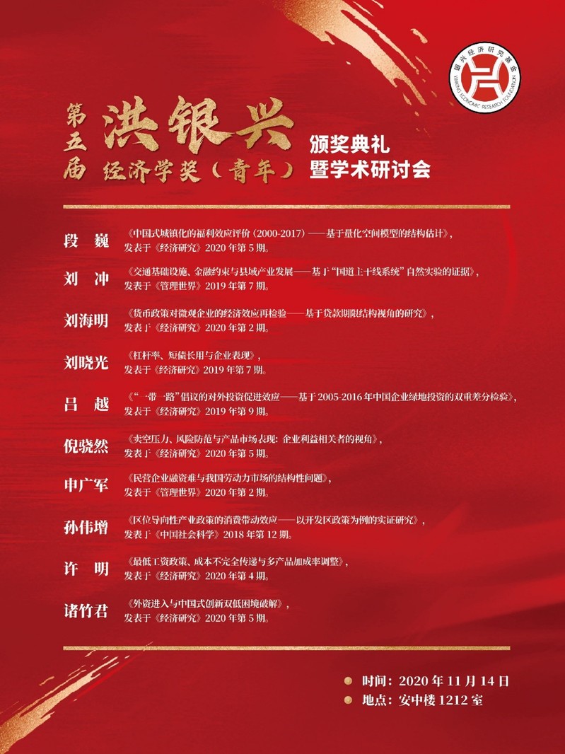 第五届洪银兴经济学奖(青年)颁奖典礼暨学术研讨会于2020年11月14日在永利集团88304官网隆重举行,取得了圆满的成功。