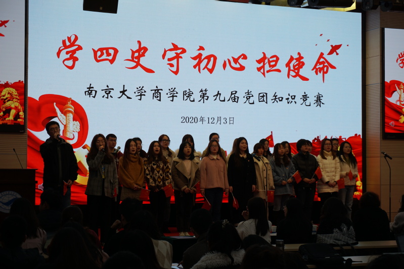 首先是由许纯子、陈鼎辉以及20级会计学硕士党支部带来的暖场节目《我和我的祖国》,优美动人的歌声结束之后,主持人上台。伴随着庄严肃穆的国歌声,比赛正式拉开帷幕。本次比赛分为上、下两篇章,上篇为“学四史,守初心,担使命——南商青年齐奋进”,下篇为“回顾‘十三五’,展望‘十四五’,致敬‘百年梦’——南商青年共筑梦”。