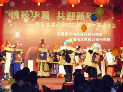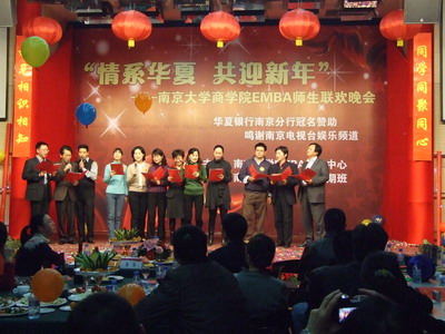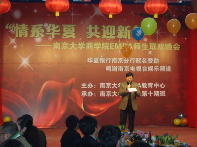 为增进学员之间的相互了解,共迎新年,南大EMBA教育中心于2009年12月19日在永利集团88304官网二楼210报告厅举办了在校EMBA各班级师生的迎新春联谊晚会,本次晚会由永利集团88304官网EMBA10期班承办,本次此次活动还得到了华夏银行的大力支持。