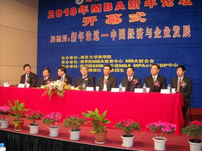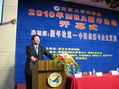 赵曙明院长在致辞中提到了本次论坛的创新性,他说:“永利集团88304官网MBA论坛在社会上已经产生了一定的影响,尤其是今年的MBA新年论坛,我们突出了高校要为社会服务的功能,在扬子晚报的支持下,作为一次社会公益活动,接受了不少社会贤达与关心学校发展的有志青年来一道展望2010年的中国宏观经济形势及企业家对中国企业持续发展的大事。”最后,赵院长提到管理学大师彼得·德鲁克教授指出,“企业家的创新,最重要的是管理创新”,后经济危机时期,我们要加强人力资源管理与开发,加大绿色经济、循环经济和低碳经济的人才培养,提高管理创新水平,为中国经济的腾飞做出贡献。