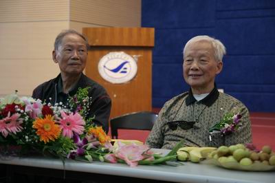张二震书记代表学院为华彬清老师庆祝九十周岁生日、为沈海山老师庆祝八十周岁生日,祝福两位寿星健康长寿。陈传明院长、沈坤荣院长、吕亚红书记为两位寿星送上鲜花、蛋糕和红包。