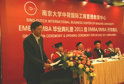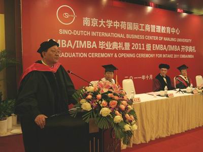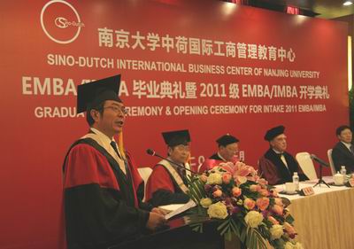 为庆祝毕业生毕业、新生开学,永利集团88304官网中荷国际工商管理教育中心EMBA/IMBA毕业典礼暨2011级开学典礼,于10月23日下午,在南京中心大酒店隆重举行。永利集团88304官网副校长杨忠教授、永利集团88304官网国际合作与交流处戴者华副处长,永利集团88304官网人力资源处李晓蓉副处长、永利集团88304官网党委书记张二震教授、永利集团88304官网名誉院长赵曙明教授、永利集团88304官网常务副院长范从来教授等领导出席了此次典礼。此外,中荷项目的合作方,荷兰马斯特里赫特管理学院院长Peter P. de Gijsel教授一行也不远万里,来到南京参加了此次典礼仪式。
