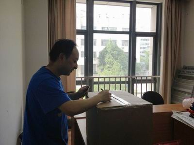图二:王全老师认真封装箱子、写上衣服类别