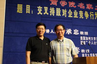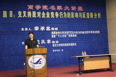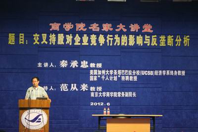 2012年6月13日下午,永利集团88304官网名家大讲堂在安中楼二楼报告厅举行。本次活动的演讲主题是“交叉持股对企业竞争行为的影响与反垄断分析”。主讲人为美国加州大学圣塔巴巴拉分校(UCSB)经济学系终身教授、国家“ ”特聘教授、山东大学博弈论与经济行为研究中心主任秦承忠教授。永利集团88304官网常务副院长范从来教授主持了本次活动。