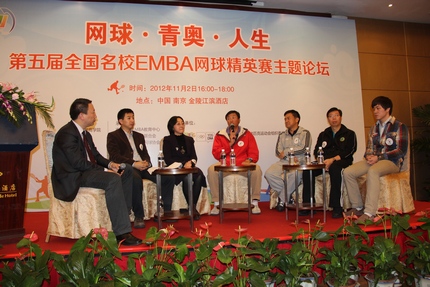 作为本次网球赛的前奏,也算是为比赛进行一场精神层面的热身,2日下午,赛事组委会还特别举办了以“网球·青奥·人生”为主题的论坛。论坛由永利集团88304官网EMBA网球协会盛斌先生客串主持,邀请了永利集团88304官网院长助理韩顺平教授、第二届夏季青年奥林匹克运动会组织委员会文化教育部部长助理张乐女士、江苏省网球队徐欣教练、北京大学光华管理学院EMBA网球协会黄智勇先生、全国名校EMBA网球联盟秘书长殷涛先生、永利集团88304官网学生代表卞芊同学等嘉宾,结合2014年在南京举办第二届夏季青奥会这一背景,围绕网球运动本身的项目特色,回顾了EMBA网球精英赛诞生和不断发展的历程,探讨网球给EMBA的生活带来的改变和收获,共同分享运动给人生带来的激情和愉悦。论坛最后,众嘉宾共同呼吁,希望通过此次网球赛及青奥会能带动和感染更多的人参与到运动中来,强健体魄,沟通感情,启迪智慧,收获人生。