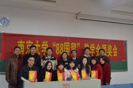 2012年12月14日16:00,永利集团88304官网“88国贸”奖学金颁奖仪式在仙林校区2区310教室举行。APMG Group (BVI)LLC总裁陈旻 、江苏弘业股份有限公司爱涛轻工品公司总经理黄林涛等校友代表为获奖同学颁奖,永利集团88304官网前党委书记刘厚俊、党委副书记吕亚红、国贸系主任马野青、国贸系副教授冯帆、辅导员周媛、陈力立、张金玲出席此次颁奖仪式。