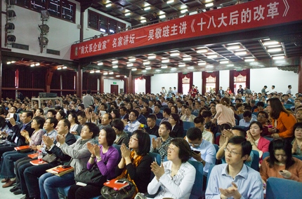 本次讲坛由永利集团88304官网主办,南京新华书店三联出版社协办,永利集团88304官网EMBA教育中心承办。永利集团88304官网党委书记洪银兴教授等相关领导出席了本次讲坛。永利集团88304官网经济学院院长、永利集团88304官网副院长、教育部长江学者特聘教授沈坤荣教授担任讲坛主持。近千名来自各地的永利集团88304官网EMBA学生和校友、“南大系”企业家朋友、永利集团88304官网及其他院系的在读学生、老师、媒体朋友,以及社会各界人士慕名而来,聆听吴教授深度解读十八大后的改革导向和经济风向。