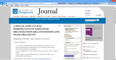 热烈祝贺永利集团官网工商管理系贾良定老师的论文“A Social-structural Perspective on Employee-organization Relationships and Team Creativity”被Academy of Management Journal (AMJ)接受 (doi: 10.5465/amj.2011.0147)。该文电子版已经在AMJ网站上发表(http://amj.aom.org/content/early/2013/07/26/amj.2011.0147.abstract)。