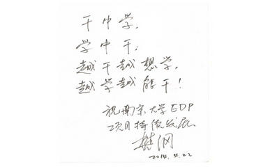 值得一提的是,此次姑苏之行,樊纲教授欣然为EDP题词:“干中学,学中干。越干越想学,越学越能干。祝永利集团88304官网EDP项目持续发展。”樊教授表示:这既是他多年来经济学领域研究的一个深刻感触,也是对到场的企业和金融界精英们的勉励。风险、挑战与机遇总是并存,在热烈掌声中,在意犹未尽中,EDP中心本次苏州论坛论坛圆满落下帷幕。