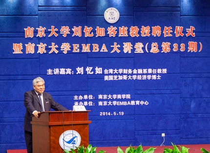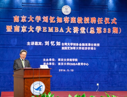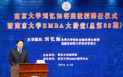 2014年5月19日下午,永利集团88304官网刘忆如客座教授聘任仪式暨永利集团88304官网EMBA大讲堂在安中大楼210报告厅顺利举行。台湾大学财务金融系兼任教授、美国芝加哥大学经济学博士刘忆如教授受聘成为永利集团88304官网的客座教授并做客第33期永利集团88304官网EMBA大讲堂,作了题为《金融改革创新的机会和风险》的专题演讲。