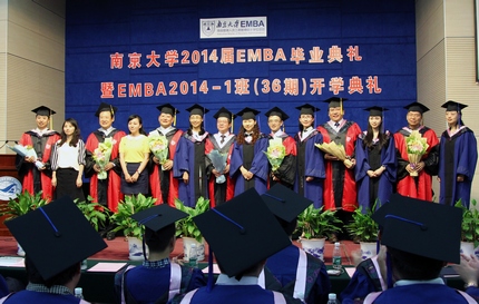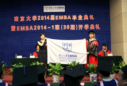 此次典礼不仅是欢送2014届EMBA毕业生,更迎来了2014-1班(36期)的新同学。校、院领导为新生颁发了校徽及学生手册。新生代表娄伟民表示,要铭记南大的校训,在南大的平台里提高自我,完成学业。院长助理韩顺平教授向新班级授予了班旗,代表“南大系”一员的班旗在韩院长的挥舞下,高高地飘扬在会场上空。