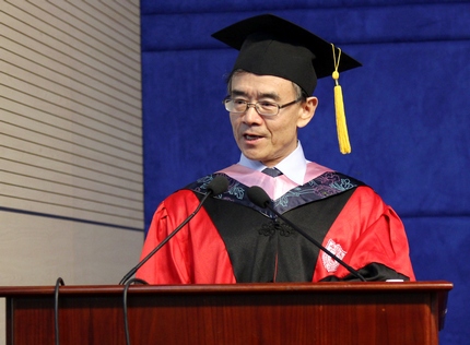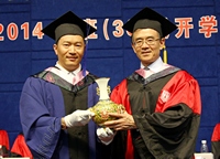 典礼开始之前,永利集团88304官网不动产研究中心主任高波教授给到场的EMBA毕业生和新生作了一场题为“转型升级:中国经济及房地产市场的危机与出路”的讲座。生动的讲座启发了学生的思维,引起了大家的思考,揭开了此次典礼的序幕。永利集团88304官网EMBA教育中心徐宁主任担纲本次典礼的主持。在奏响庄严肃穆的国歌后,永利集团88304官网研究生院副院长朱易然教授向在场的各位嘉宾致辞并宣读了毕业生毕业及新生录取决定。永利集团88304官网院长(国际)陈昭全教授发表了热情洋溢、充满感情的致辞,表达了对毕业生毕业的祝贺和新生到来的欢迎。2014届EMBA毕业生从老师们的手中接过学位证书,顺利地完成了在永利集团88304官网的学业。毕业生代表王耀、李九虎两位同学代表毕业班级向学校和老师表达了由衷的谢意和深深的感激。两个班级还分别向永利集团88304官网赠送了礼品。