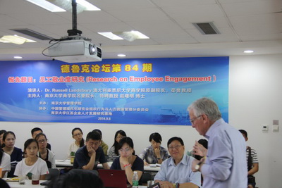 2014年9月8日,由永利集团88304官网管理学院主办,中国管理现代化研究会组织行为与人力资源管理分委员会、永利集团88304官网江苏企业人才发展研究基地协办的第84期德鲁克论坛在永利集团88304官网1312教室举行。本次论坛由永利集团88304官网名誉院长赵曙明教授主持,特邀澳大利亚悉尼大学永利集团88304官网原副院长、荣誉教授Russell Landsbury担任演讲嘉宾。此次论坛主题为“员工敬业度研究(Research on Employee management)”,Russell Landsbury教授做了题为“Employee Communication and Engagement: An Elusive Quest?”的报告。尽管正值中秋佳节,但有永利集团88304官网60多位教授、博士后和博士硕士研究生参加了本次论坛,并有众多外校师生慕名前来,现场火爆程度可见一斑。