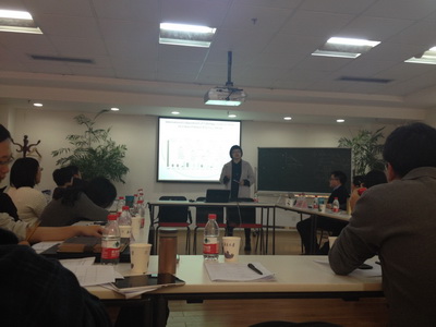 上午研讨首先由营销与电子商务系的宋培建开始抛砖引玉,他从软件平台治理视角探讨双边网络效应的产生机理,引发了大家的广泛兴趣和讨论。汪秋泓则在非常有限时间里分享了三个大数据背景下网络安全管理的研究主题,包括网络犯罪的国际化法律惩治、网络黑客论坛讨论与黑客行为的关系与信息技术产品并购,拓展了大家的研究视野。接着,孙永洪老师介绍了YouTube推出广告分成政策后网民上传自制视频的行为变化的研究,指出YouTube推出广告分成的激励政策后,网民上传的视频数反而有下降的趋势,与会老师纷纷对这一现象提出了各自的解读和分析。任菲则带来最新的研究进展汇报,她着眼于淘宝与微博最新合作的产物微淘,探讨基于微淘的社会化媒体对企业营销的影响。最后,张诚则带来了一个引发激烈讨论的与性别有关的研究主题,他发现在对抗类网络游戏中无论女性玩家在游戏中感知到对方是女性身份还是男性身份,她们的游戏行为不会发生明显的改变,而男性玩家在面对他们感知的女性身份对手时,会更加努力地进行游戏,因此认为女性在竞争环境中更加理性,而男性更喜欢挑战,针对该主题的讨论持续到中午1点钟,大家仍然意犹未尽。