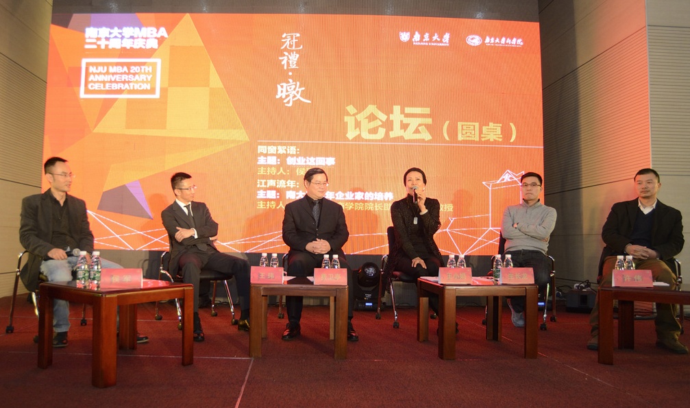 短暂的茶歇过后,圆桌论坛正式开始。第一场是“同窗絮语:创业这回事”,由苏州中骨医疗科技发展有限公司总经理侯军主持,南京华维会智商业管理有限公司执行董事王玮、亚洲信息投资控股公司董事长费卫亭、北京京瑞房主有限公司(京瑞大厦)副董事长兼总经理王小娟、恒捷投资董事长生长龙、车易淘网络信息技术有限公司许伟五位有过创业经历的校友和大家分享了自己的创业故事。提到创业关键词,他们总结为:“业务模式、足够专业、学会孤独”“积累、专注、价值、坚持”“找到认同的人做认同的事”“品牌、模式、团队”“梦想、资金、团队”。