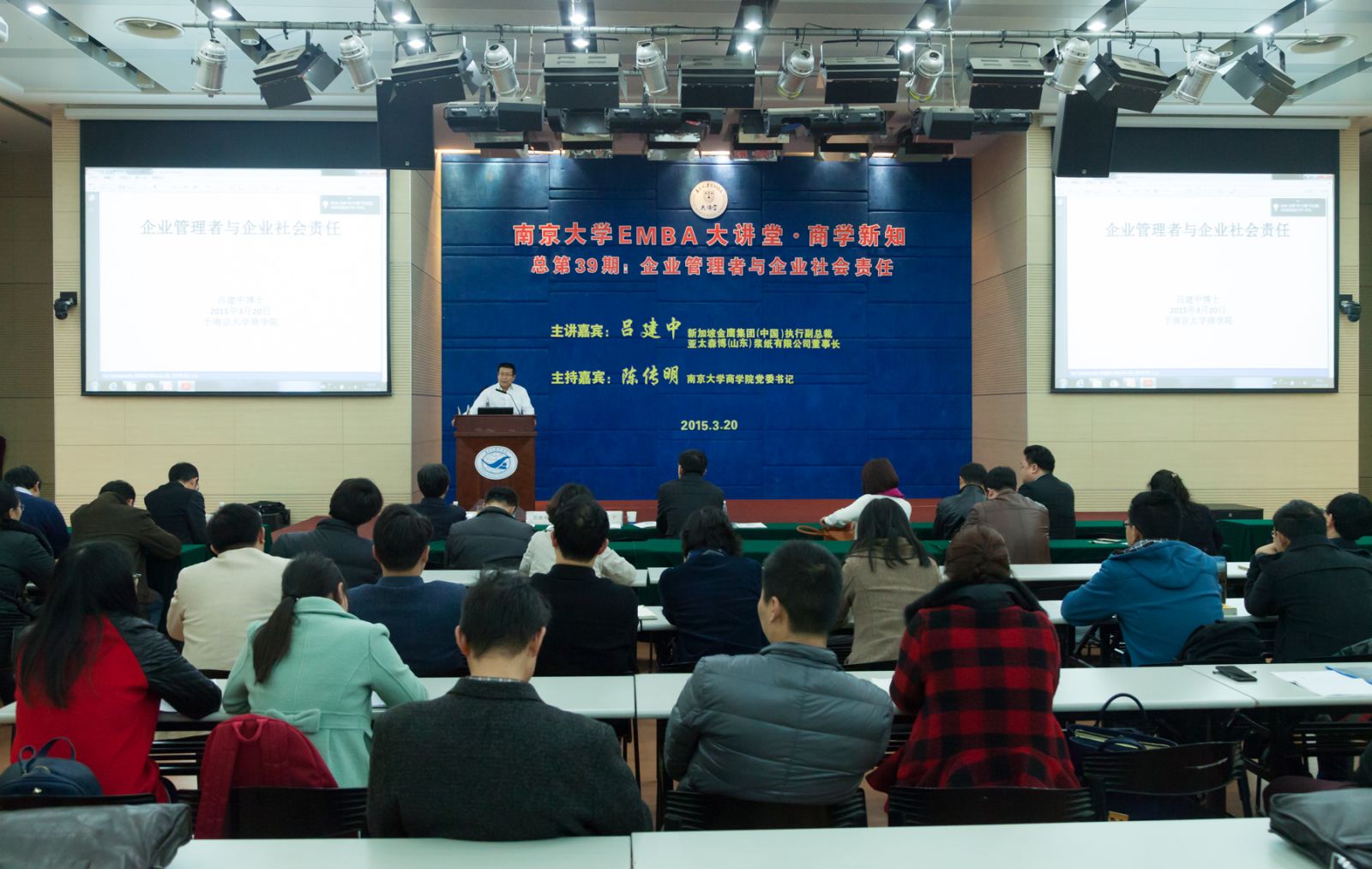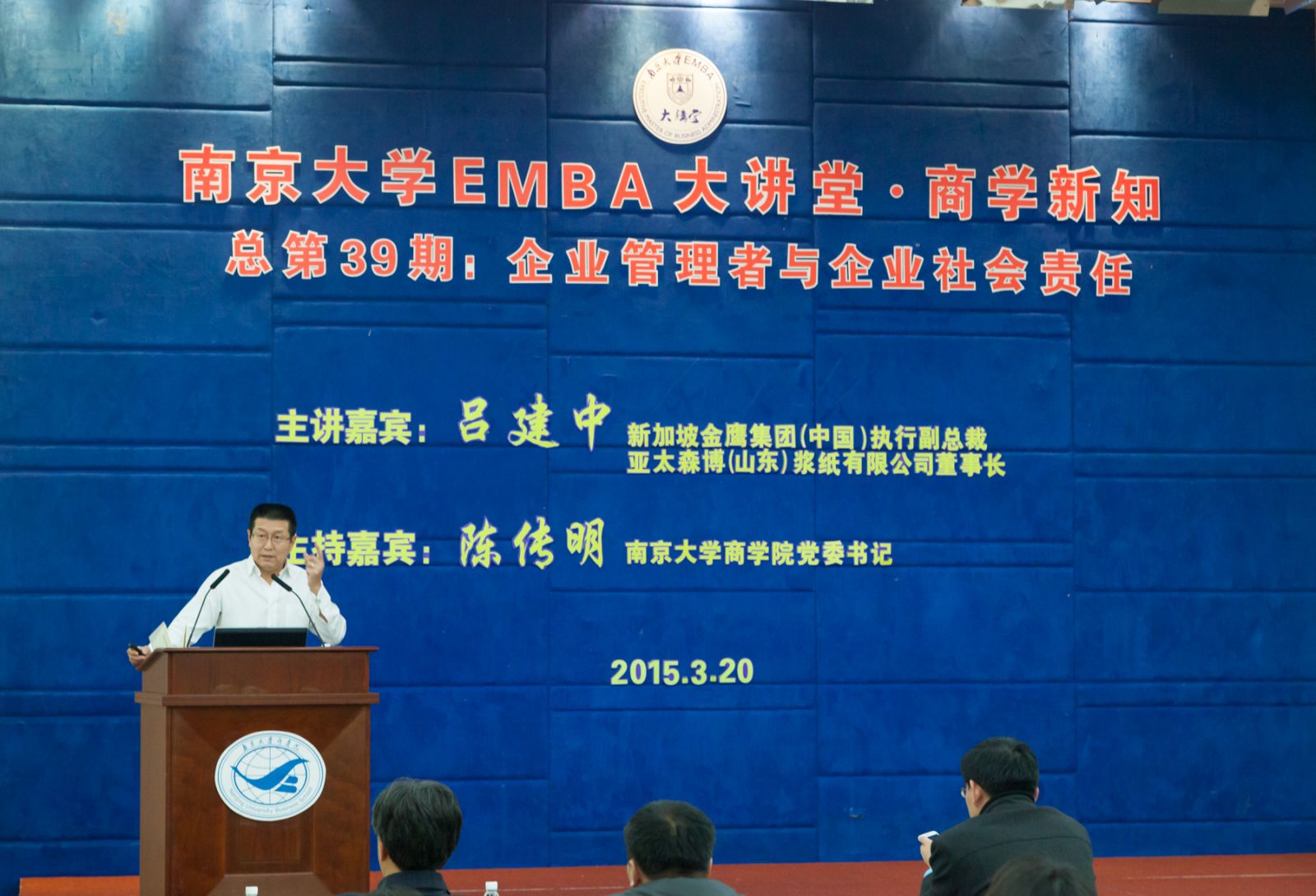 3月20日,永利集团88304官网EMBA大讲堂•商学新知(总第39期)在安中大楼鸿意报告厅开讲,新加坡金鹰集团(中国)执行副总裁兼亚太森博(山东)浆纸有限公司董事长吕建中博士向100多位EMBA学员做了主题为《企业管理者与企业社会责任》的讲座。永利集团88304官网党委书记陈传明担任嘉宾主持。