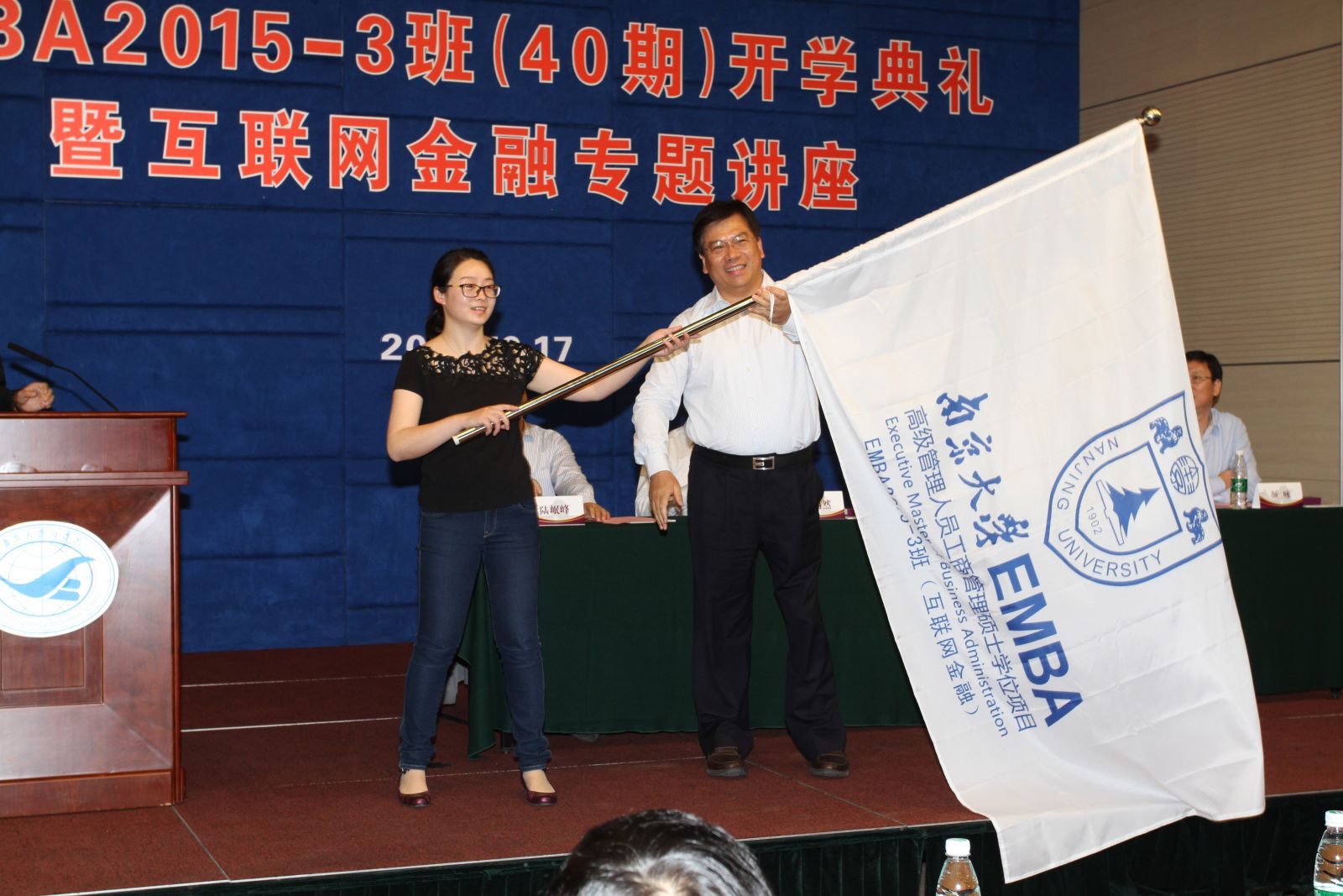 永利集团88304官网执行院长沈坤荣教授为新班授予班旗,舞动的班旗飘扬在主席台上,激发了斗志,引起同学们的阵阵欢呼。