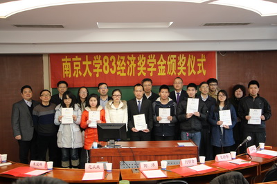 2015年12月18日下午,永利集团88304官网“83经济奖学金”颁奖仪式在鼓楼校区安中楼隆重举行。83级经济学系的校友代表鸿意地产公司董事长陶炜、副总经理宋利群、平安银行南京分行副行长刘国强、华夏基金前副总经理张后奇、江苏省连云港市商务局副局长刘明台、深圳果实资本合伙人朱爱林与永利集团88304官网校长助理范从来教授、永利集团88304官网党委副书记吕亚红老师等共同出席了颁奖仪式。仪式由永利集团88304官网经济学院马骏老师主持。