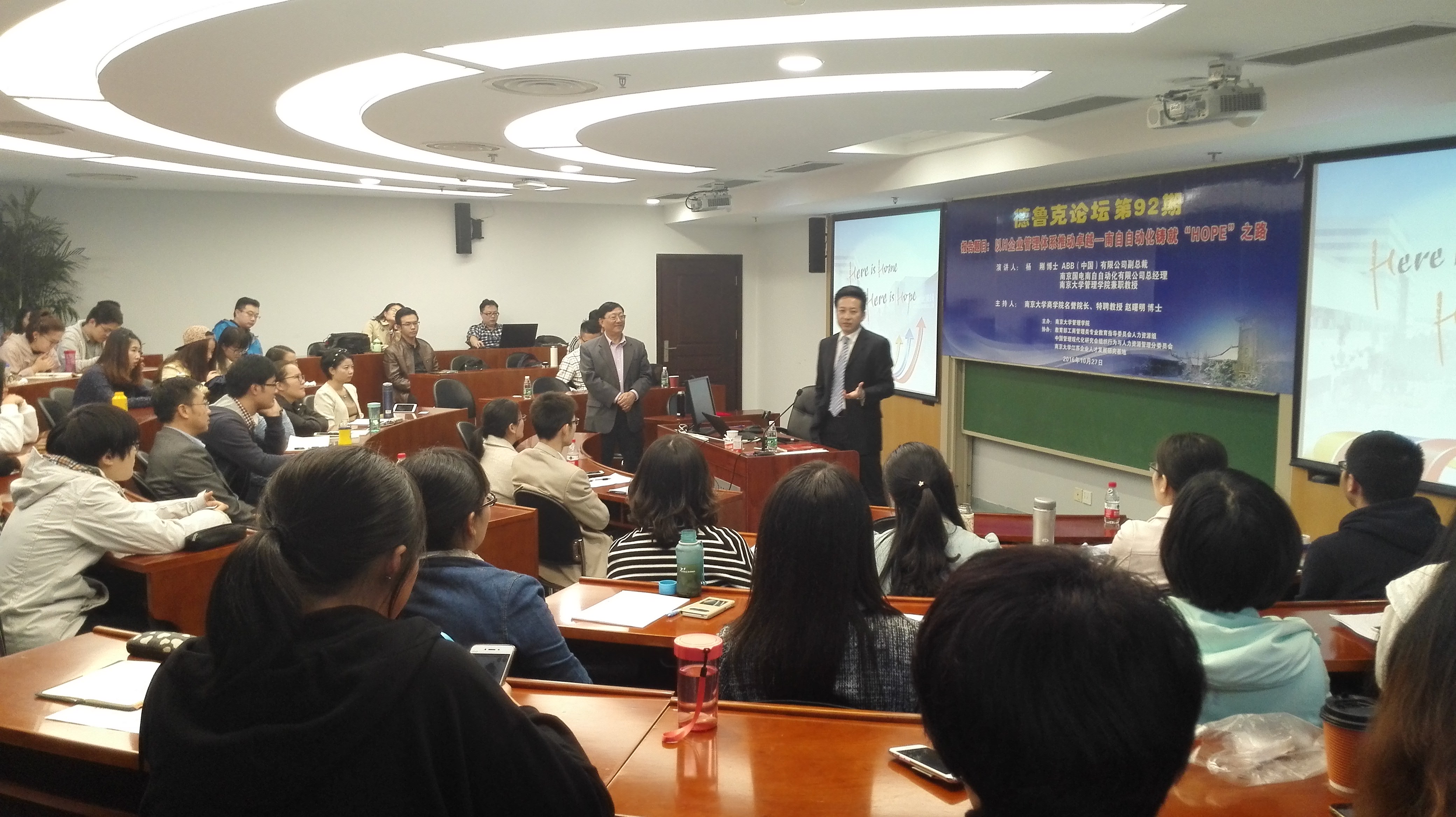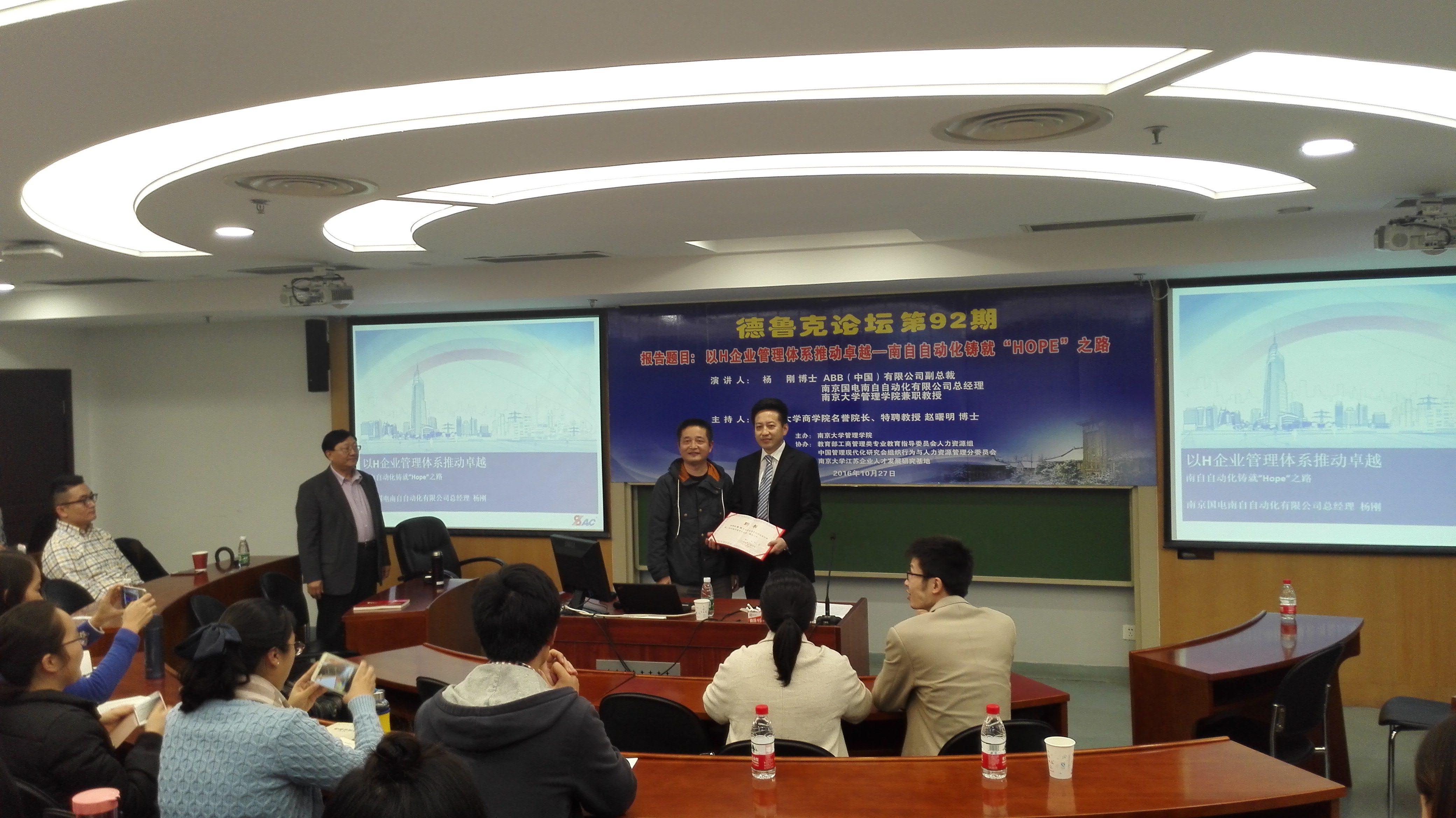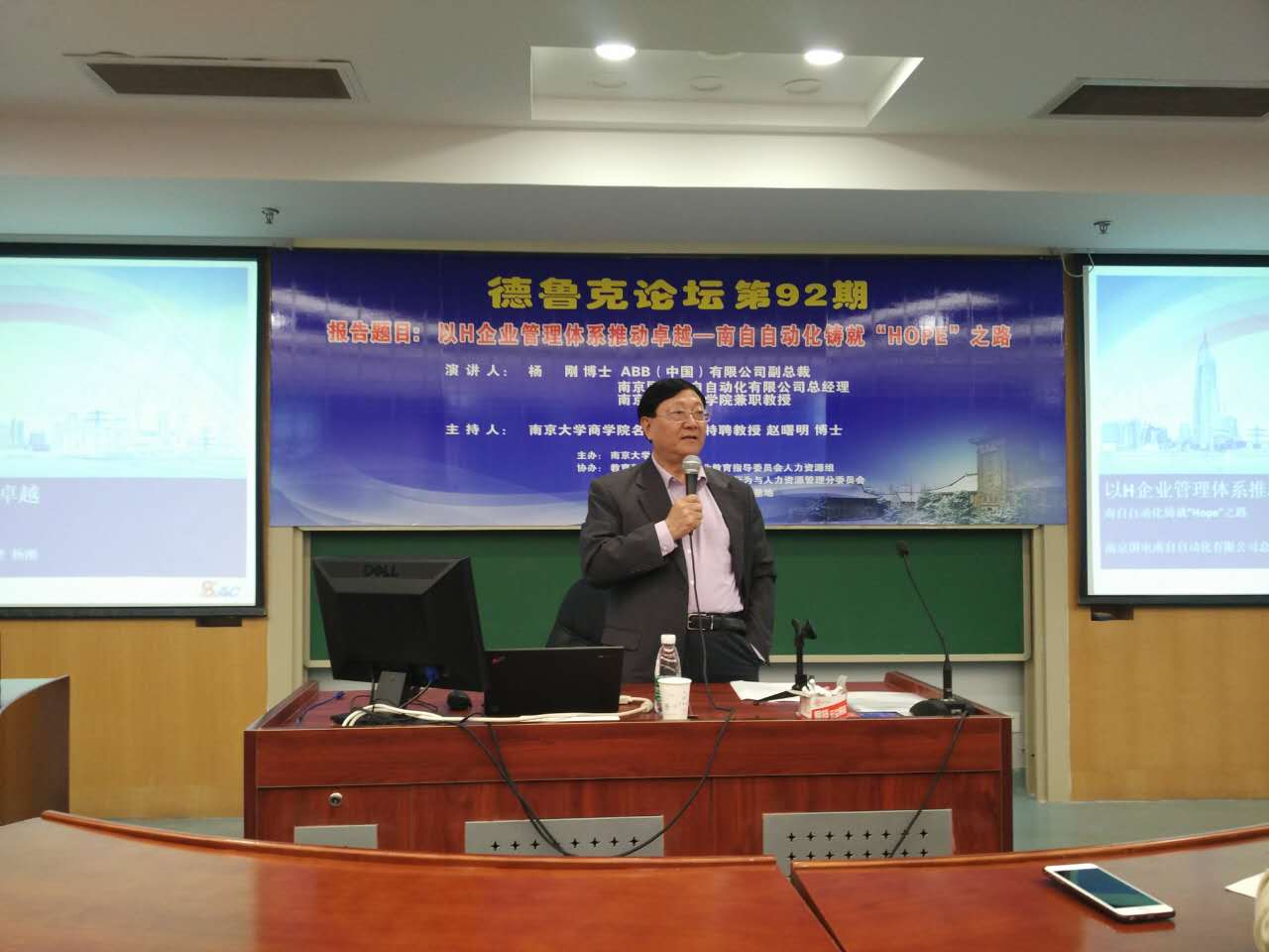 2016年10月27日15:30,第92期德鲁克论坛:以H企业管理体系推动卓越—南自自动化铸就“HOPE”之路,在永利集团88304官网301教室如期举行。此次德鲁克论坛由永利集团88304官网管理学院主办,教育部工商管理类专业教育指导委员会人力资源组、中国管理现代化研究会组织行为与人力资源管理分委员会、永利集团88304官网江苏企业人才发展研究基地协办。ABB(中国)有限公司副总裁、南京国电南自自动化有限公司总经理杨刚博士应邀分享了南自的H管理体系如何铸就‘HOPE’之路并推动卓越的历程,永利集团88304官网名誉院长赵曙明教授主持了此次论坛。
