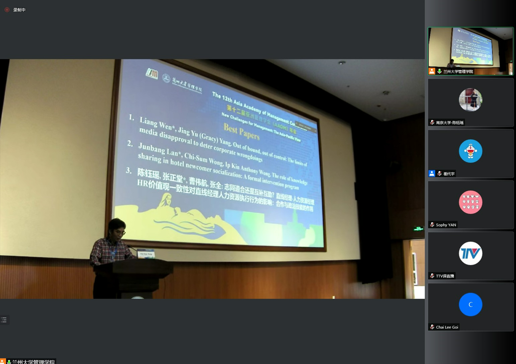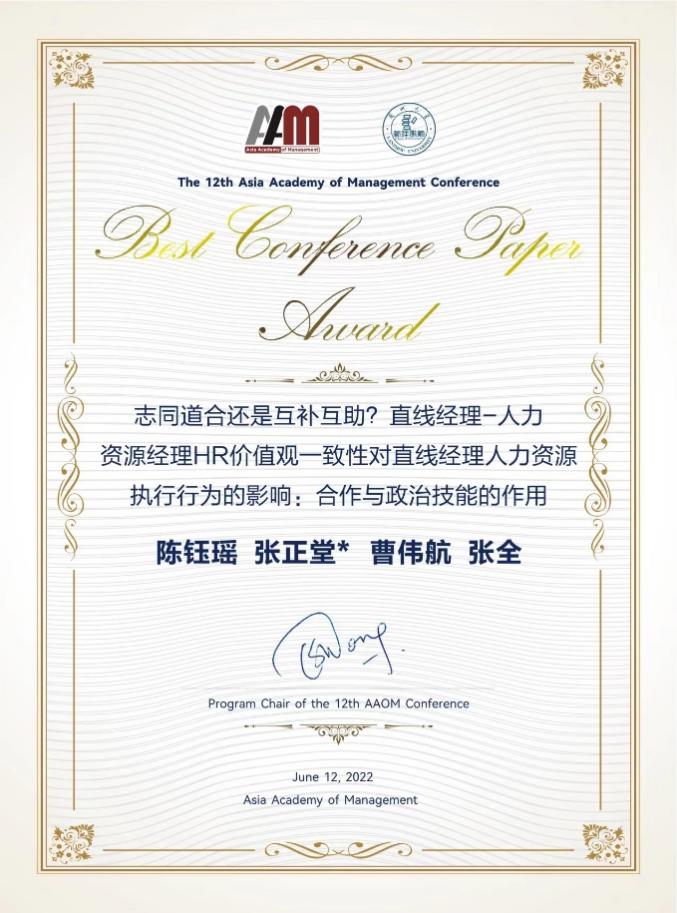 2022年6月11日-13日,第十二届亚洲管理学会(英文:Asia Academy of Management,简称AAOM)年会以“线上+线下”的形式在兰州大学召开。永利集团官网工商管理(人力资源管理方向)2019级博士生陈钰瑶、2020级博士生曹伟航、张全与导师张正堂教授合作完成的论文“志同道合还是互补互助?直线经理-人力资源经理HR价值观一致性对直线经理人力资源执行行为的影响:合作与政治技能的作用”荣获本届年会最佳论文奖(Best Conference Paper Award)。据悉,本届会议共收到论文投稿175篇,评选出3篇优秀论文。